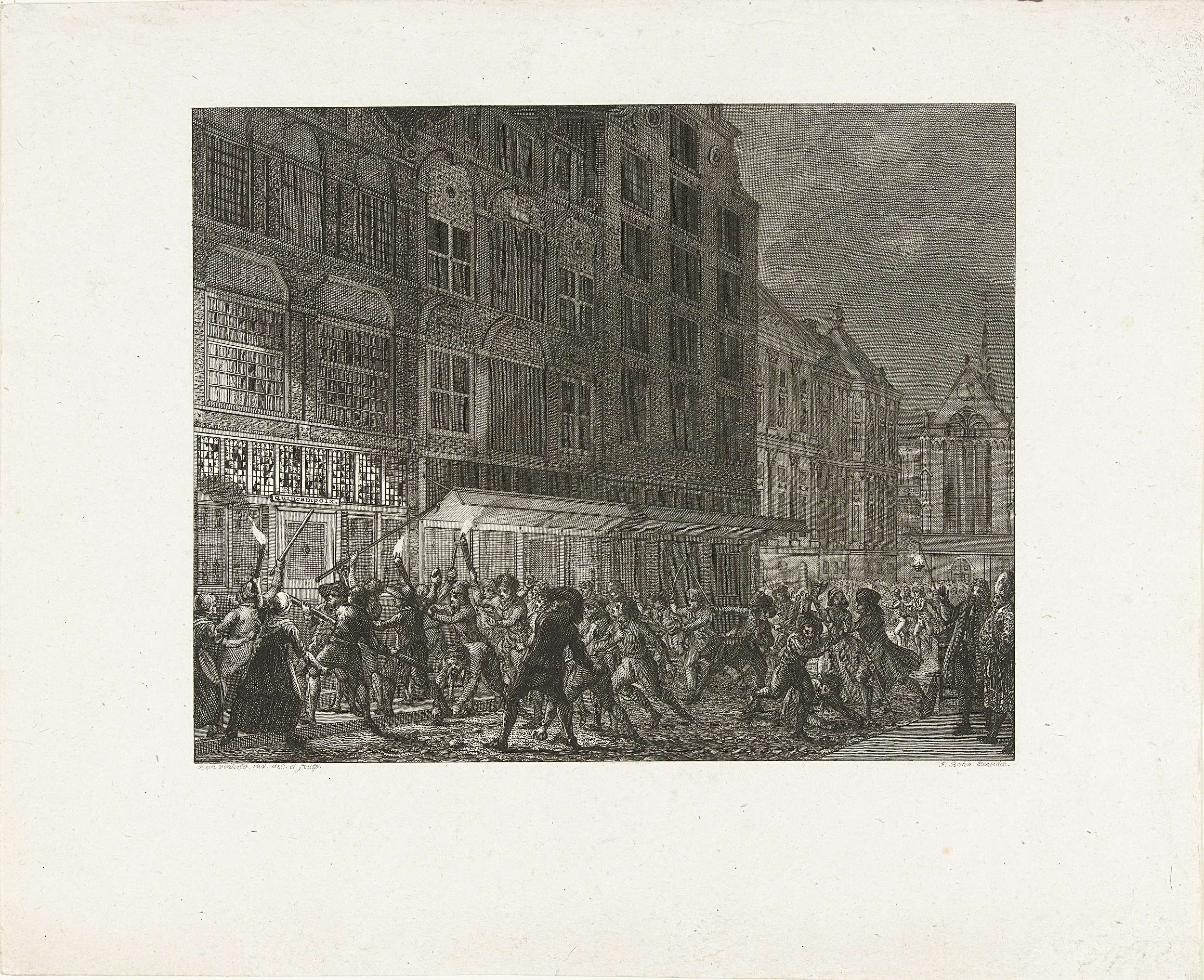 Nachtelijke plundering door een oproerige menigte van het koffiehuis Quincampoix in de Klaverstraat te Amsterdam waar veel windhandel gedreven werd, 5 oktober 1720.