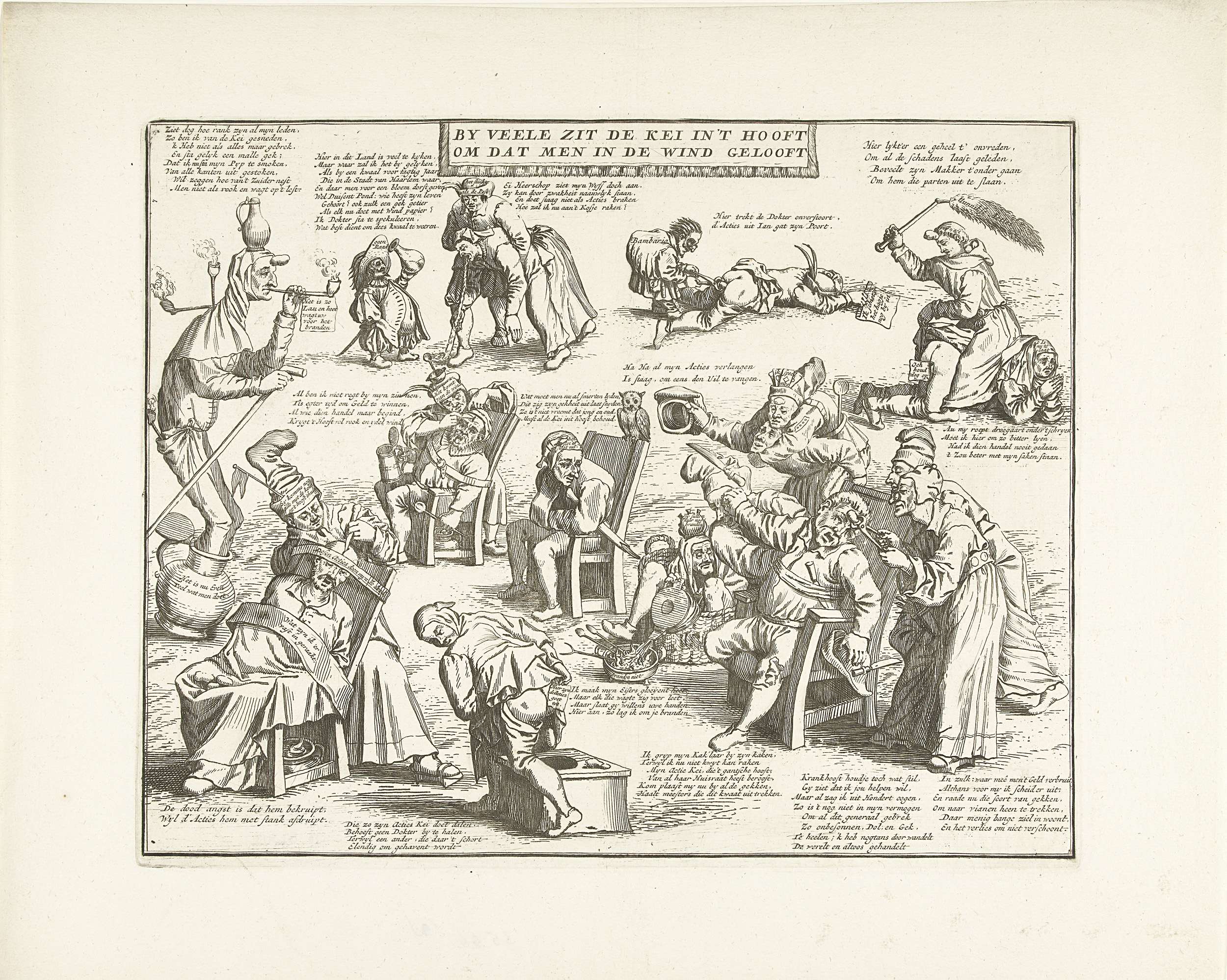 Spotprent op de mensen die zo dom zijn geweest om deel te nemen aan de windhandel in 1720. De slachtoffers laten kwakzalvers de kei uit hun hoofd snijden. Op de voorgrond veegt een nar zijn achterste af met een actie, bovenaan geselt een monnik (Broer Cornelis) de billen een non, ook met verschillende kleine mensen ...