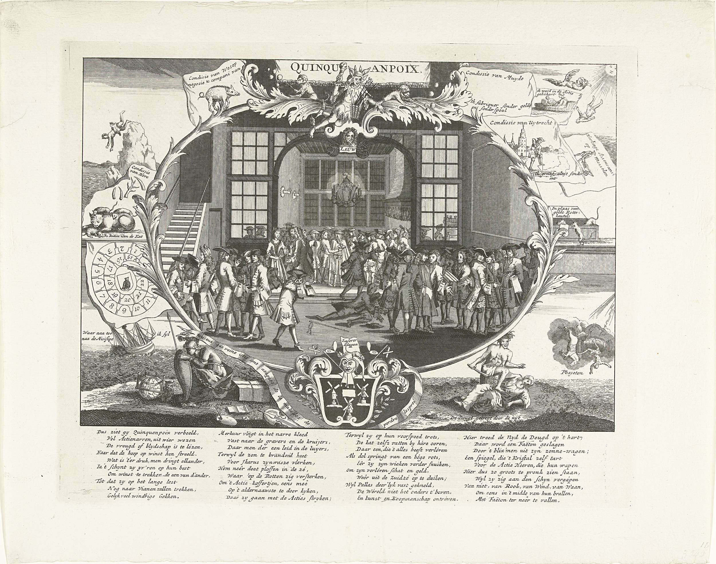 Centrale voorstelling van het koffiehuis Quincampoix in de Kalverstraat, het centrum van de actiehandel te Amsterdam, 1720. In de omlijsting verwijzingen naar projecten te Muiden, Utrecht, Harlingen, Weesp, Rotterdam en de Mississippi. Onderaan een wapen opgebouwd uit windmolens en een narrenhoofd. In het onderschrift een vers in vier kolommen. Prent 10 in de serie Het ...