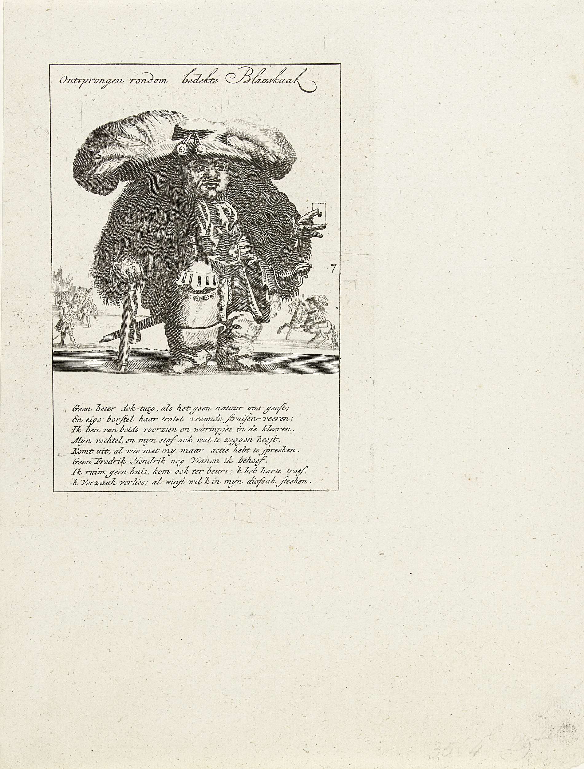 Een kleine mens als een officier met grote verenhoed en een speelkaart in de hand. Karikatuur van figuren in de windhandel, met een verwijzing in het onderschrift naar Vianen. Genummerd 7. Gedrukt van een grote plaat waarop alle vier voorstellingen genummerd 5-8 zijn geëtst. Kopie naar prent 29/7 in de serie Het Groote Tafereel der ...