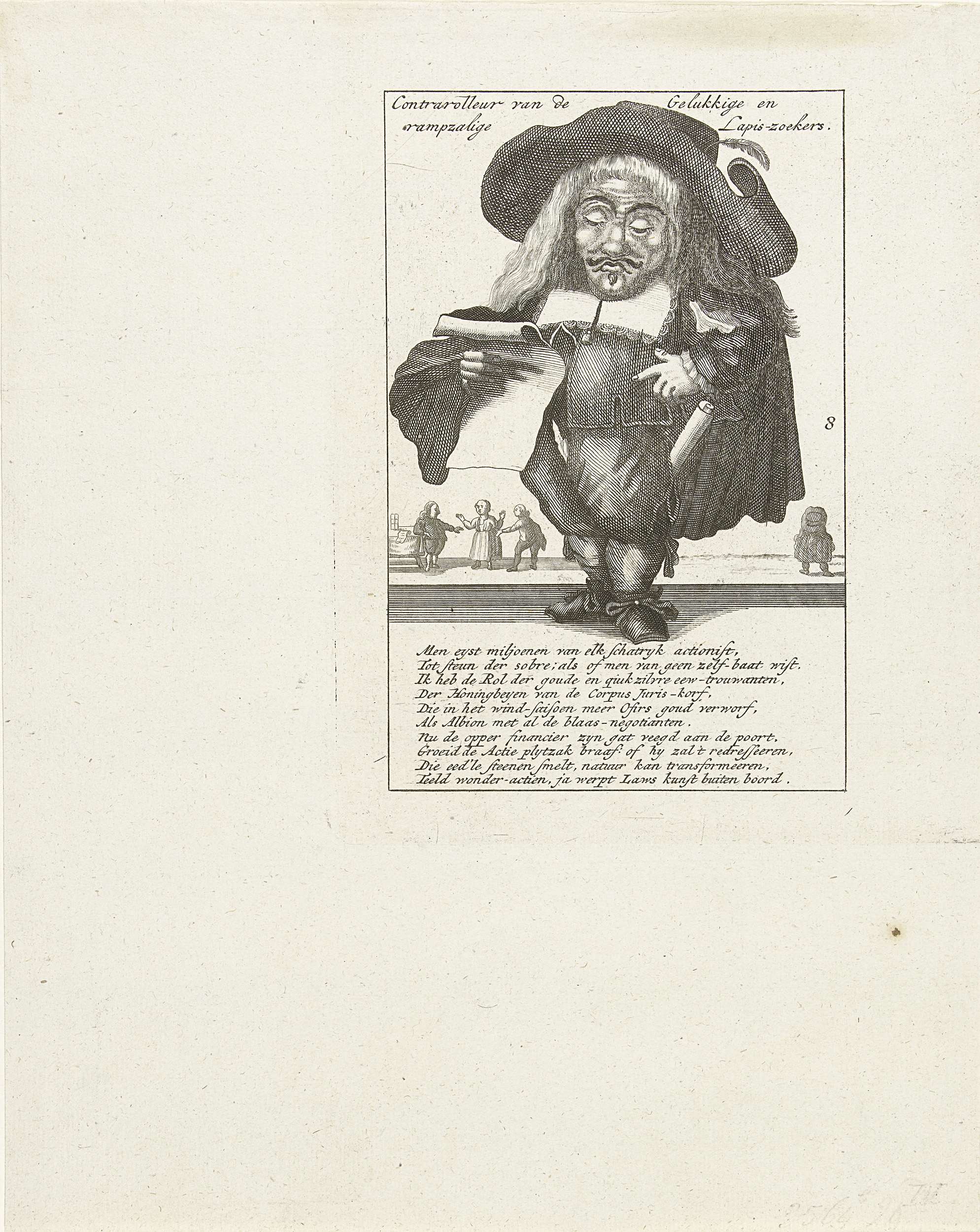 Een kleine mens met hoed die een rol papier leest. Karikatuur van figuren in de windhandel. Genummerd 8. Gedrukt van een grote plaat waarop alle vier voorstellingen genummerd 5-8 zijn geëtst. Kopie naar prent 29/8 in de serie Het Groote Tafereel der Dwaasheid met spotprenten op de Windhandel of Actiehandel van 1720.