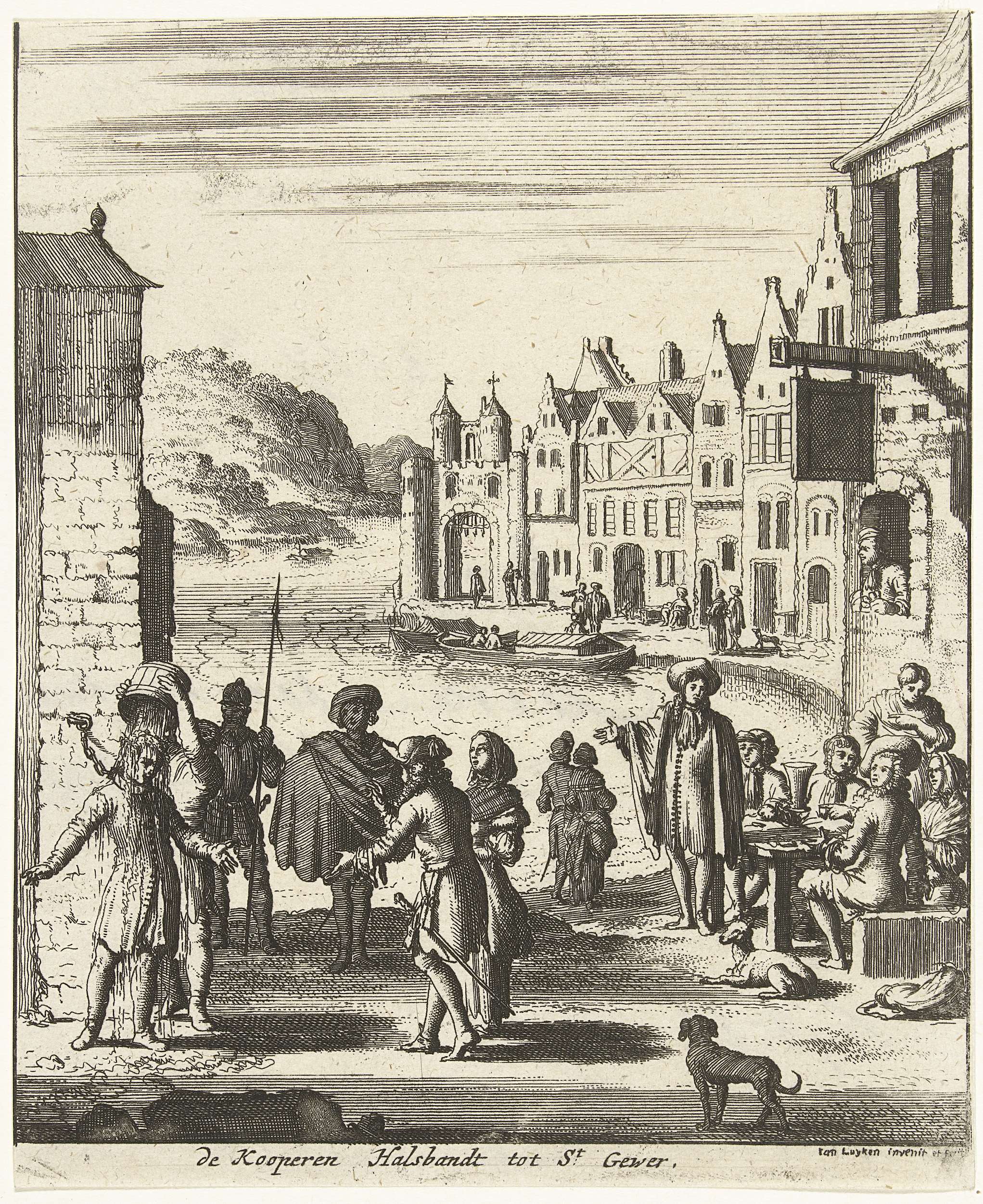 De koperen halsband te Sankt Goar, ca. 1680. Een man wordt met een koperen band om zijn hals aan de poort vastgeketend en krijgt een emmer water over zijn hoofd gegoten, rechts toeschouwers op het terras voor een herberg. Rechterdeel van een grotere plaat met de rivier de Donau, in een latere staat is de ...