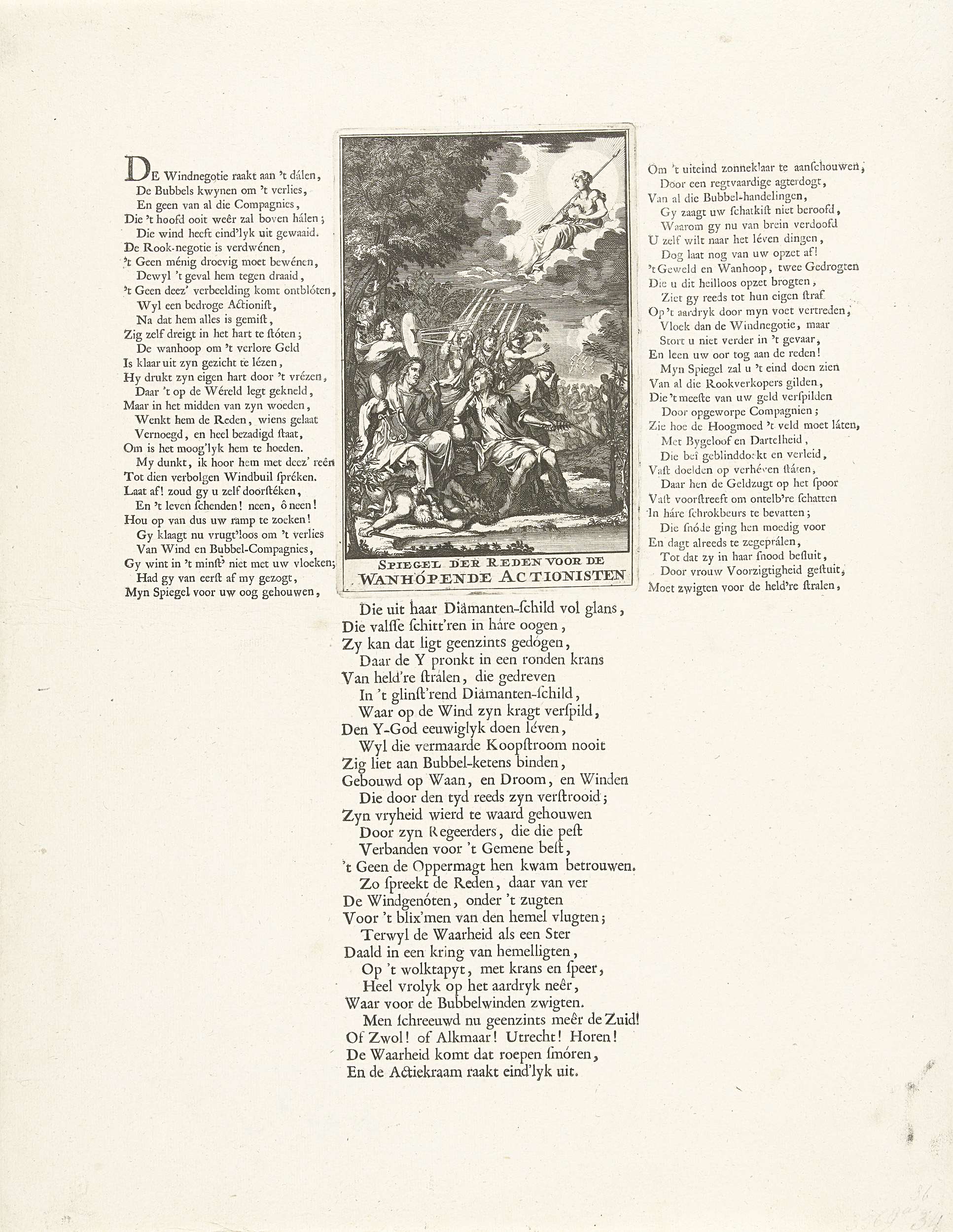 Spiegel der Reden voor de wanhopende Actionist. Een windhandelaar die op het punt staat zich met een dolk in de borst te steken wordt door de personificatie van de Reden een spiegel voorgehouden. Op de achtergrond houdt de Voorzichtigheid met een schild gemerkt Y (= het IJ te Amsterdam) de windhandel tegen. Op het blad ...