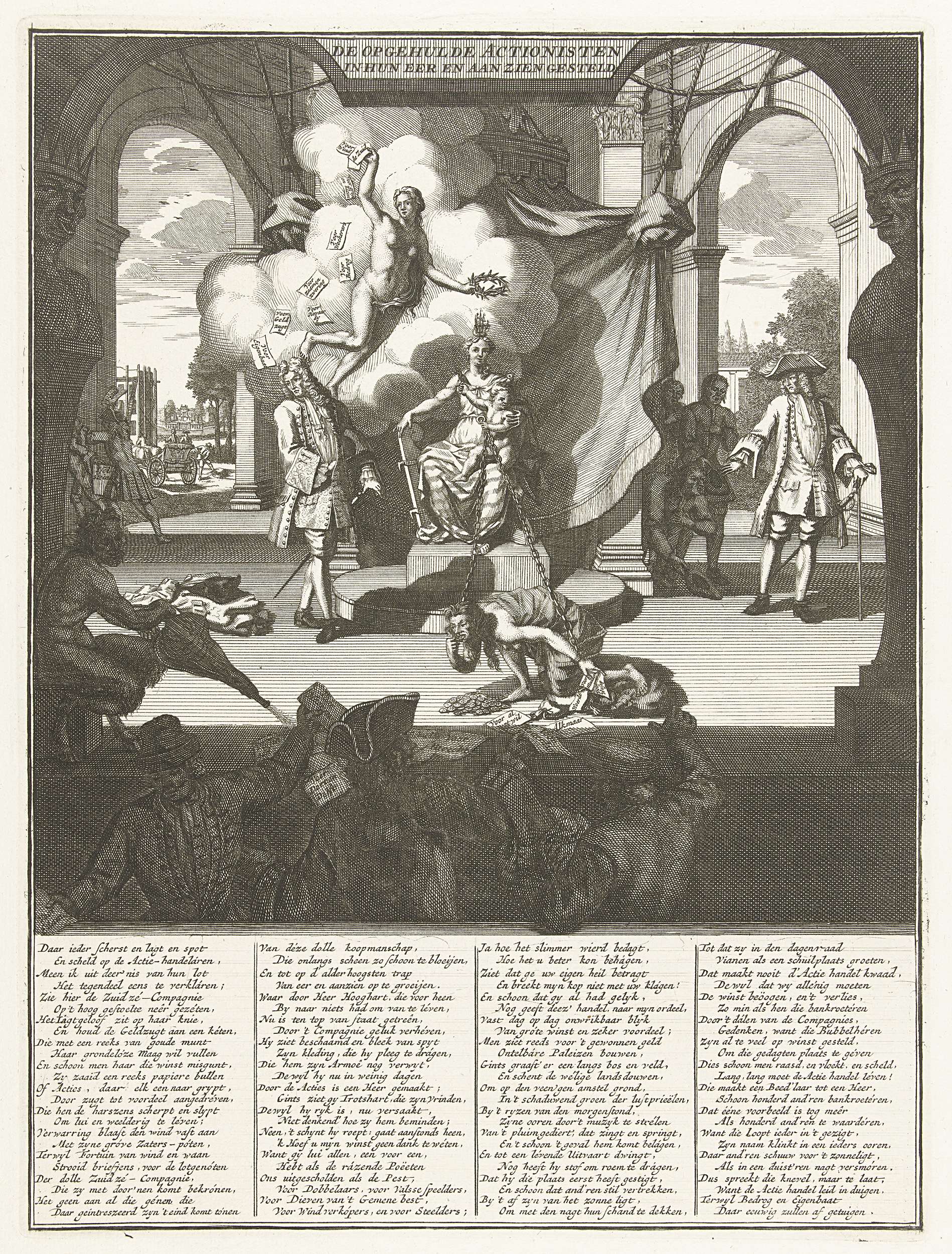 Toneel waarop de personificaties van de Zuidzee-Compagnie en Lichtgelovigheid op een troon zitten en de Geldzucht aan een ketting houden. Geldzucht eet geldstukken op en deelt papieren aandelen uit. Op de voorgrond en aan de zijkanten windhandelaren, in de wolken strooit Fortuna met papieren. Met onderschrift in vier kolommen. Prent 36 in de serie Het ...