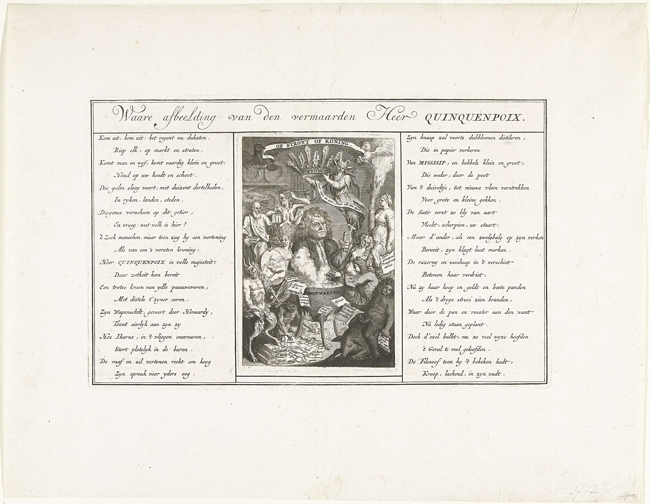 Ware afbeelding van de heer Quinquempoix. Portretmedaillon van John Law als de heer Quinquempoix boven een brouwketel waarin geldstukken worden omgetoverd tot aandelen. Heksenketel met duivels, uilen etc. Boven het portret de Zotheid met een kroon van pauwenveren en hulstbladeren. Hierboven een banderol met: Of Stront of Koning. Deze plaat afgedrukt binnen een grotere plaat ...