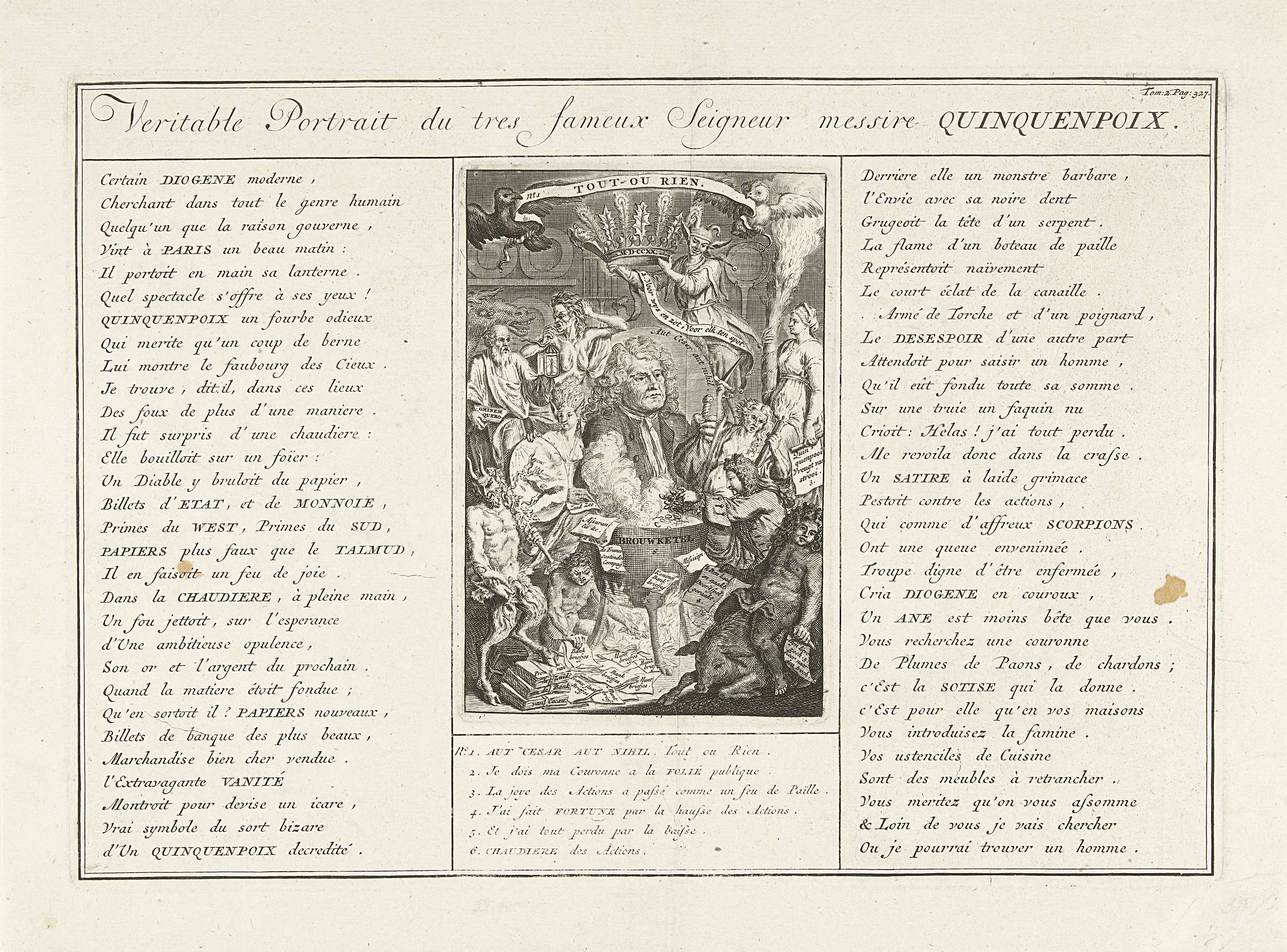 Ware afbeelding van de heer Quinquempoix. Portretmedaillon van John Law als de heer Quinquempoix boven een brouwketel waarin geldstukken worden omgetoverd tot aandelen. Heksenketel met duivels, uilen etc. Boven het portret de Zotheid met een kroon van pauwenveren en hulstbladeren. Hierboven een banderol met: No. 1 Tout ou Rien. Deze plaat afgedrukt binnen een grotere ...
