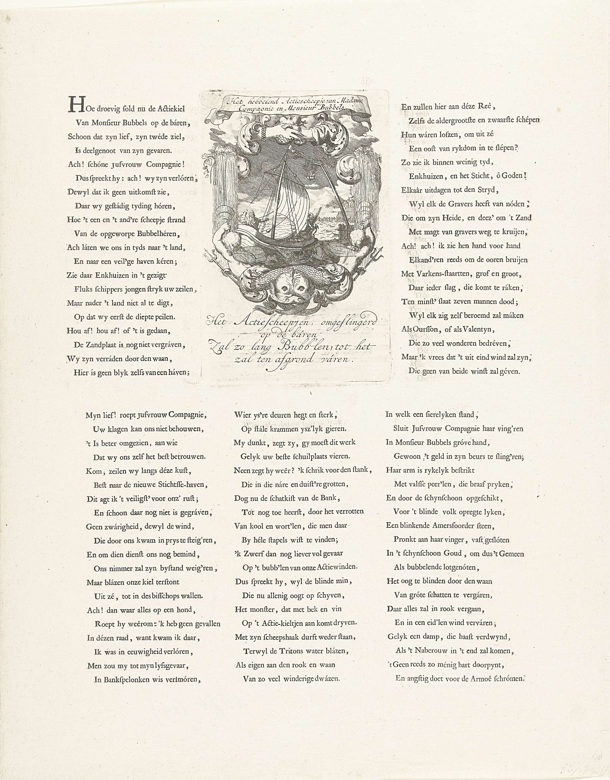 Het actiescheepje van Madame Compagnie en Monsieur Bubbels raakt in zwaar weer. Embleem met een bootje op zee, in een omlijsting metvissen, zeewezens en twee in elkaar grijpende handen met een hart als teken van huwelijkse trouw. In het onderschrift een vers van vier regels. Linksboven sporen van het weggepolijste nummer 32. Gedrukt op het ...