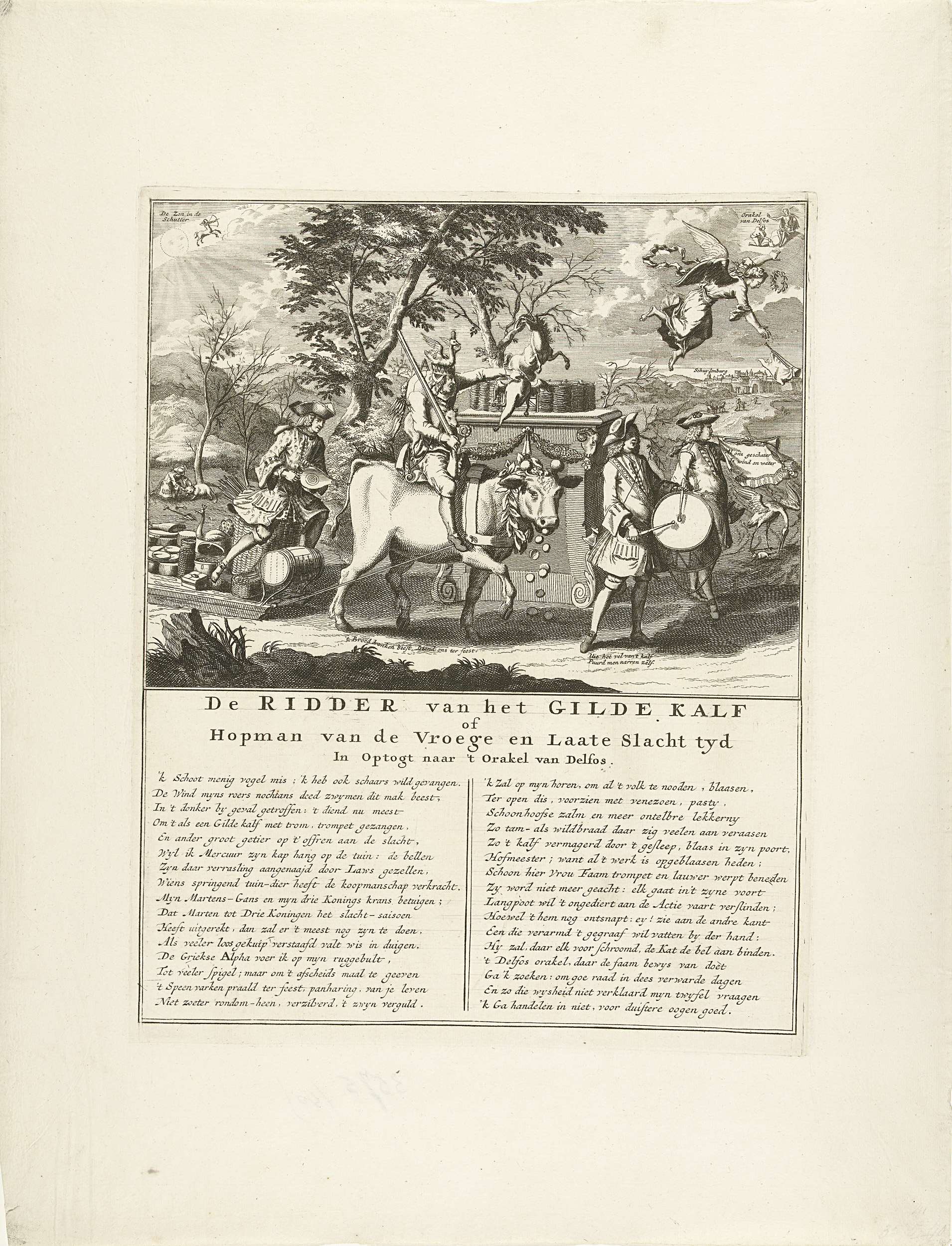 Optocht met het gildekalf bereden door een nar en voorafgegaan door een tamboer en een trompetter. Het kalf trekt een slede waarop een actionist met een blaasbalg staat. Met onderschrift in twee kolommen. Prent 40 in de serie Het Groote Tafereel der Dwaasheid met spotprenten op de Windhandel of Actiehandel van 1720.