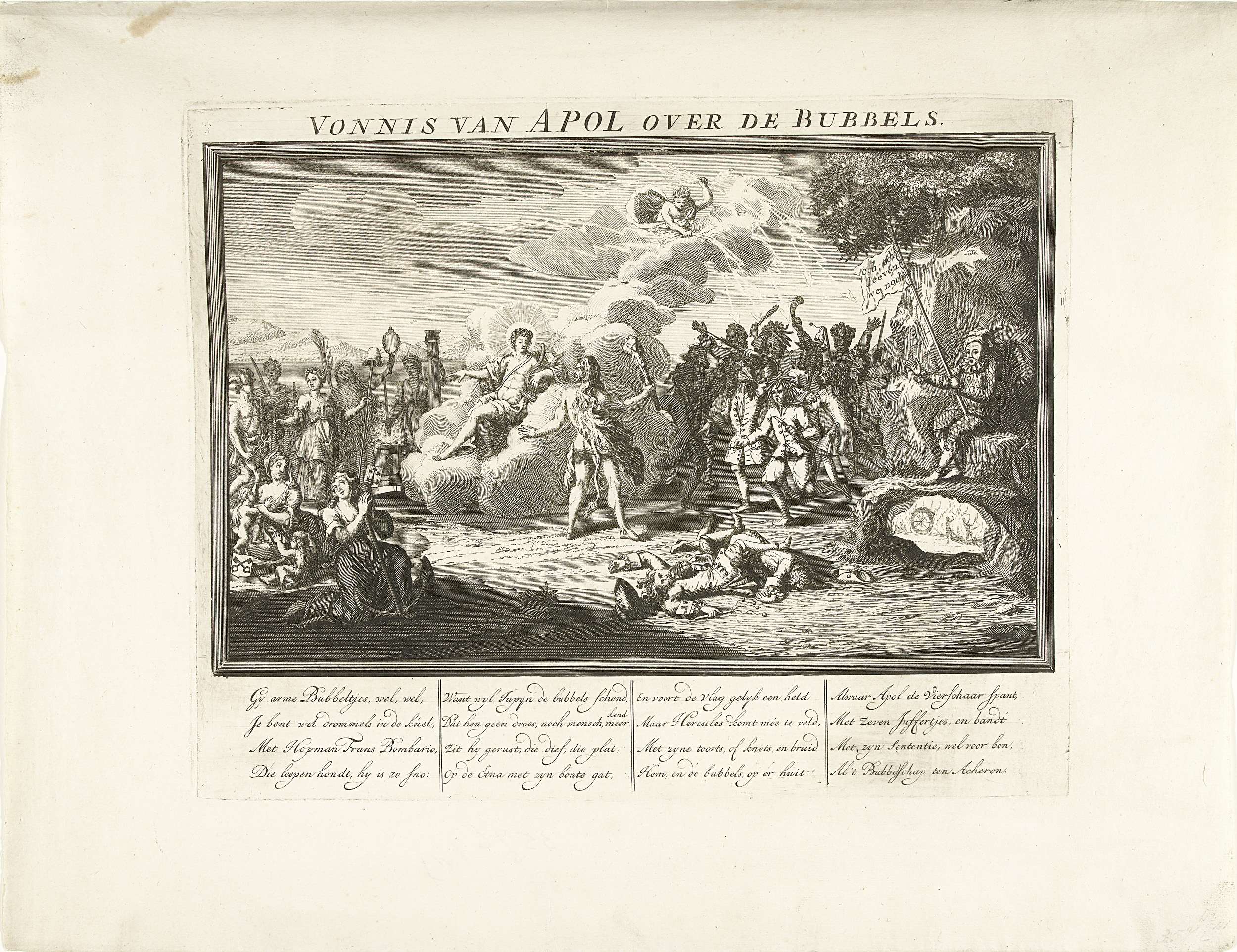 Apollo oordeelt over een groepje wanhopige Actionisten, in het midden Hercules met knots, rechts zit de harlekijn Bombario met vaandel. Links stadsmaagden als de muzen. Met onderschrift in vier kolommen. Prent 41 in de serie Het Groote Tafereel der Dwaasheid met spotprenten op de Windhandel of Actiehandel van 1720.