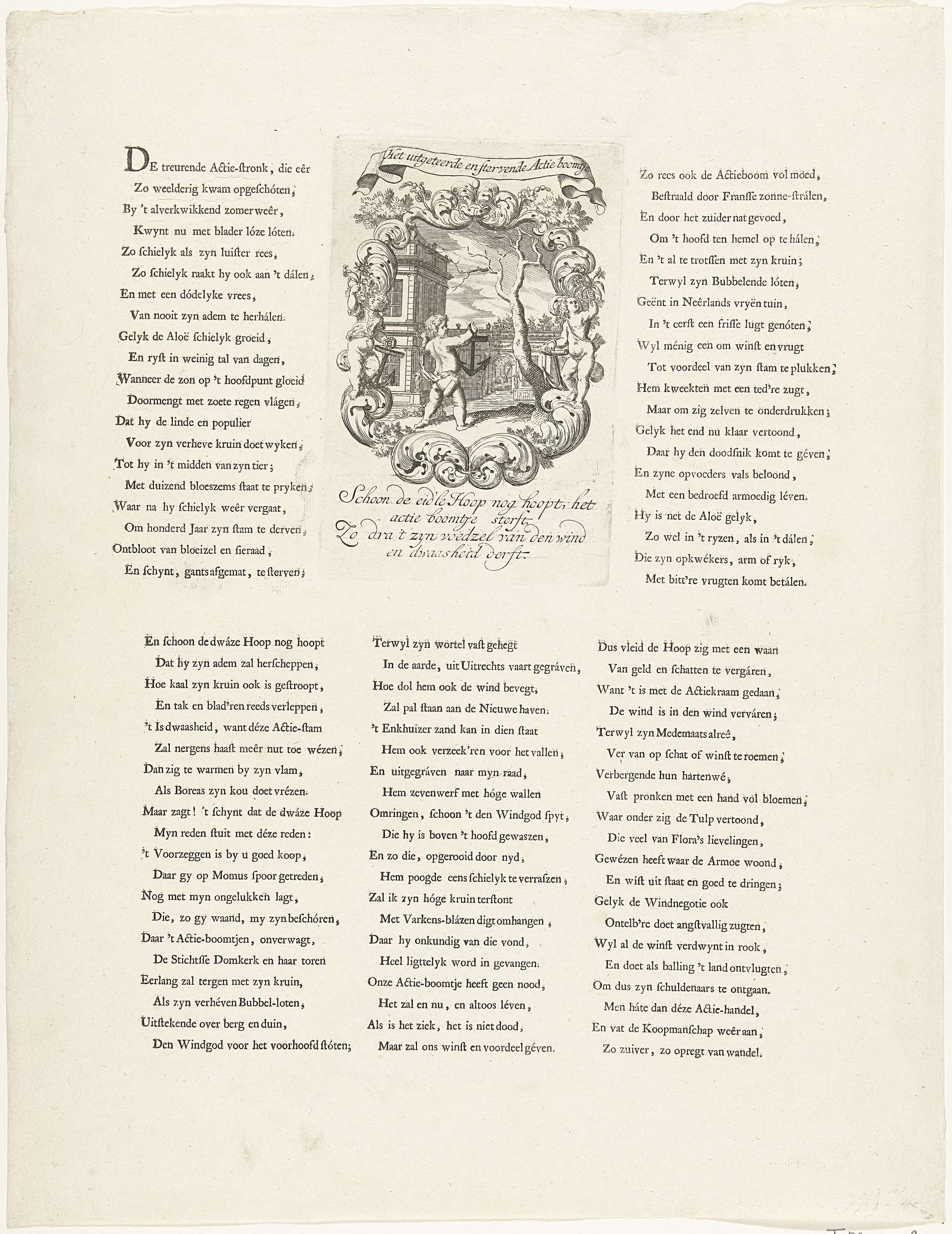 Het verdorde en stervende actieboompje. De Hoop bij een verdorde boom. In een decoratieve omlijsting met personificaties van de Hoop met ankers en bloemen. In het onderschrift een vers van vier regels. Gedrukt op het blad om en onder de plaat staan vijf verzen. Prent 42 in de serie Het Groote Tafereel der Dwaasheid met ...