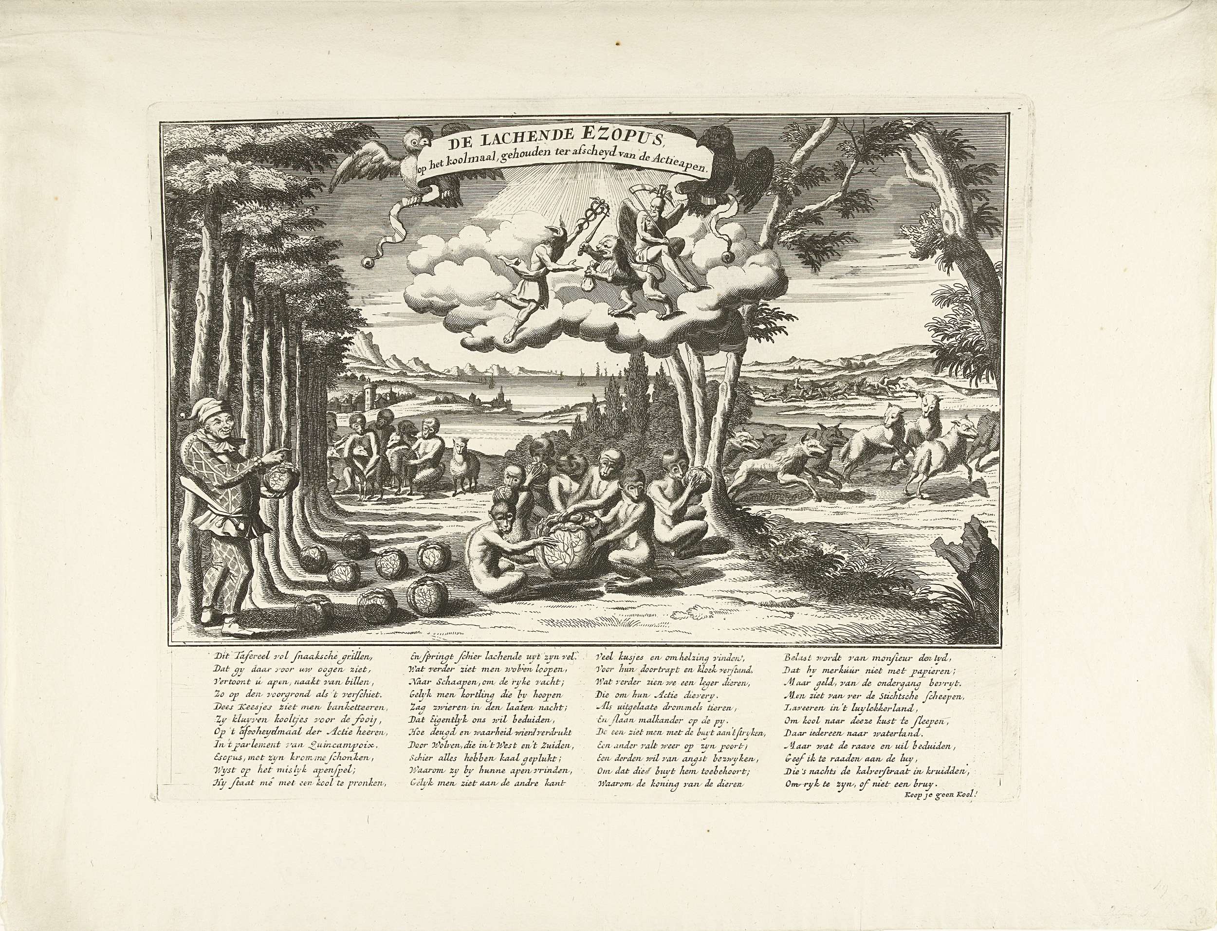 Links staat de lachende Aesopus, Bombario in harlekijnspak, bij een groep apen die kool eten (de slachtoffers van de windhandel). Rechts jagen wolven op schapen. In de wolken Mercurius, de Nederlandse Leeuw en Vader Tijd. In het onderschrift een vers in vier kolommen. Prent 48 in de serie Het Groote Tafereel der Dwaasheid met spotprenten ...