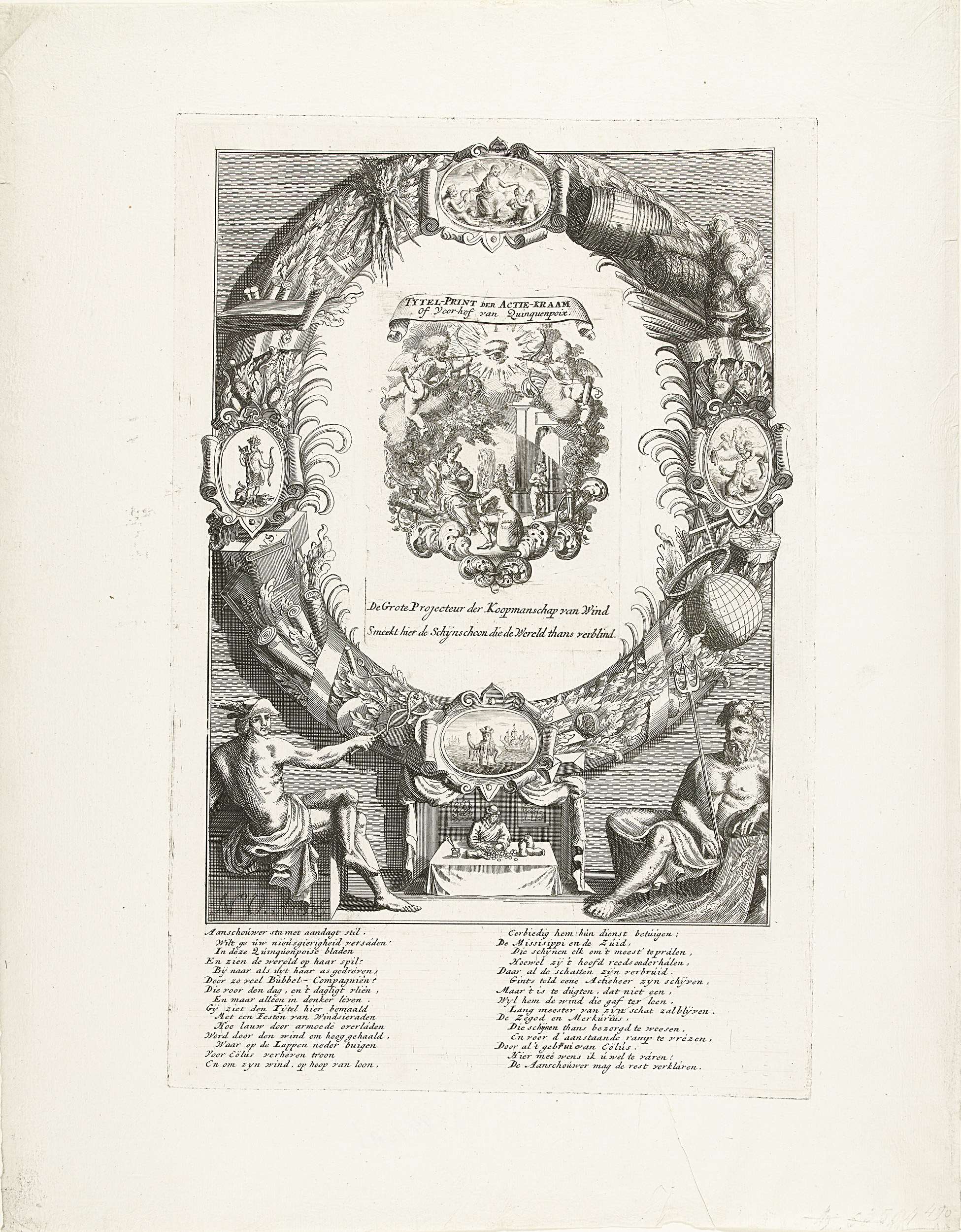 Titelprent van de Actiekraam of het Voorhof van Quinquenpoix. In de centrale voorstelling knielt een man met een liefdesverklaring voor een vrouw die hem afwijst (volgens de tekst: John Law en Schoonschijn), in de omlijsting cupido's en pijlenkokers. Met twee regels in het onderschrift. Deze plaat is afgedrukt in het midden van een grotere plaat ...