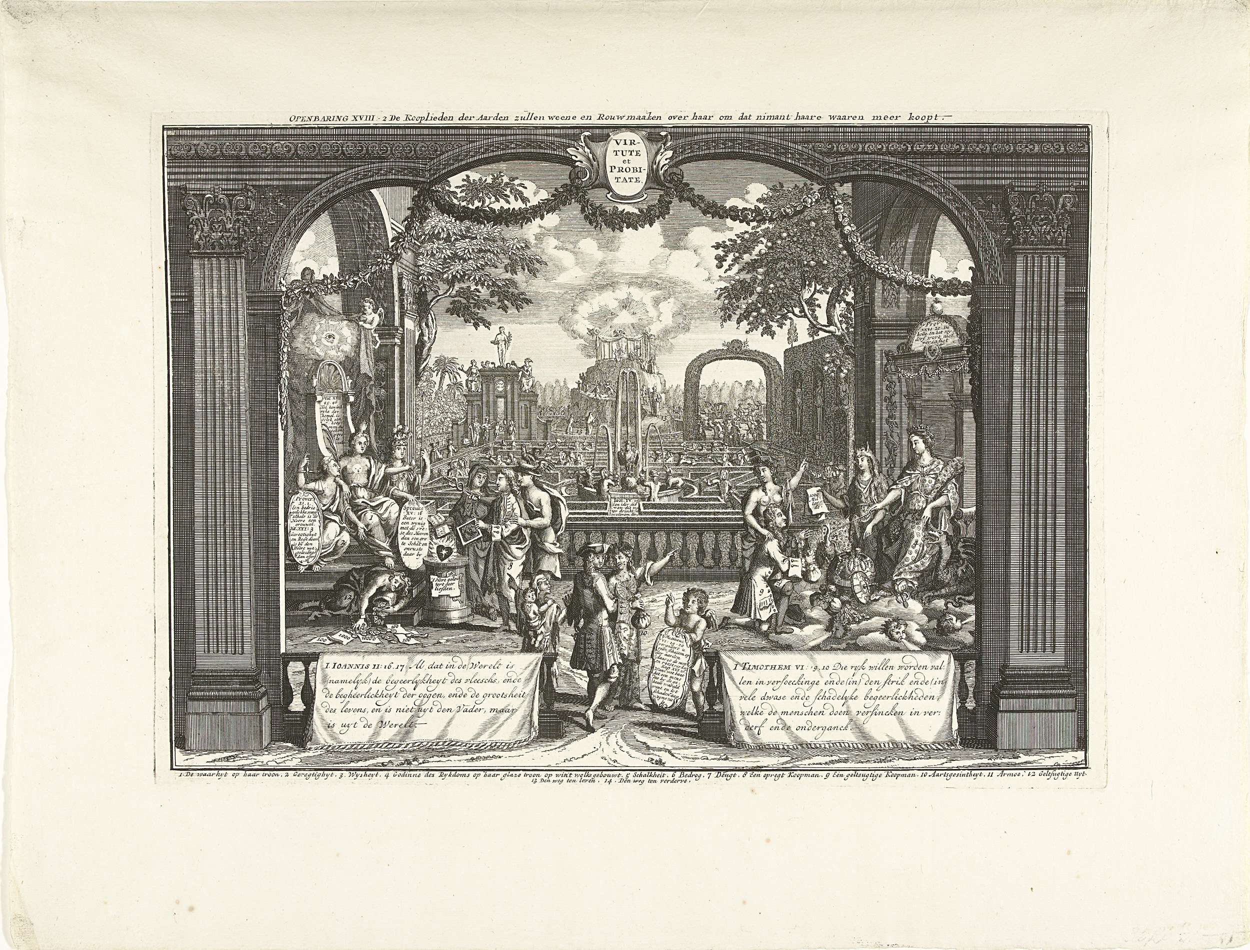 De oprechte en de geldzuchtige koopman. Links de oprechte koopman met Mercurius en Deugd voor de troon van de Waarheid, rechts de geldzuchtige koopman (de windhandelaar) met Bedrog en Schalkheid voor de troon van de Rijkdom. Op de balustrade bijbelcitaten. Op de achtergrond een tuin met een doolhof met de smalle en de brede weg. ...