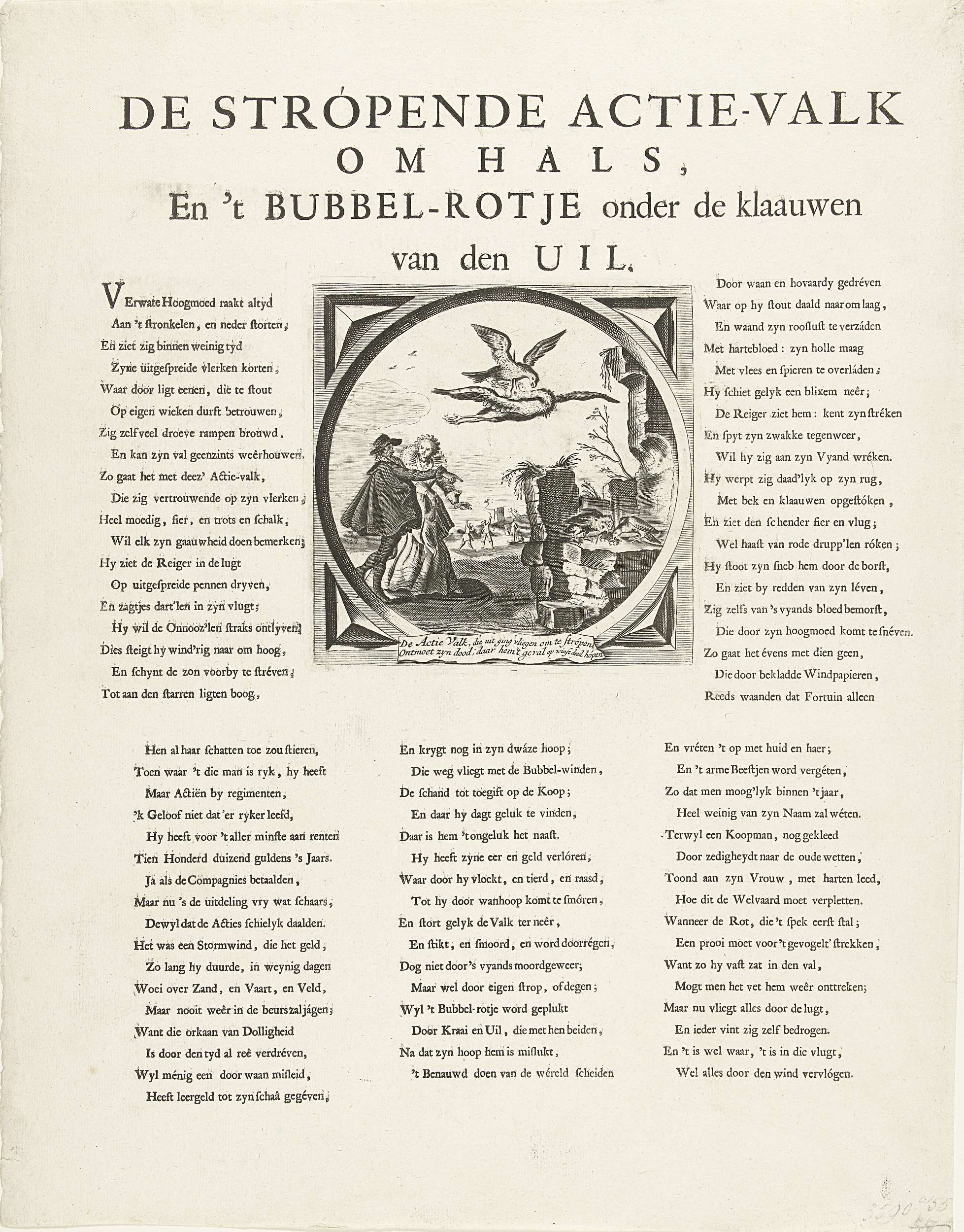 Embleem waarin een valk (de actievalk) die mee wil eten van de buit (het bubbelratje) van de uil, wordt gedood door een reiger. Met vijf verzen aan weerszijden en onder de plaat. Prent 55 in de serie Het Groote Tafereel der Dwaasheid met spotprenten op de Windhandel of Actiehandel van 1720.