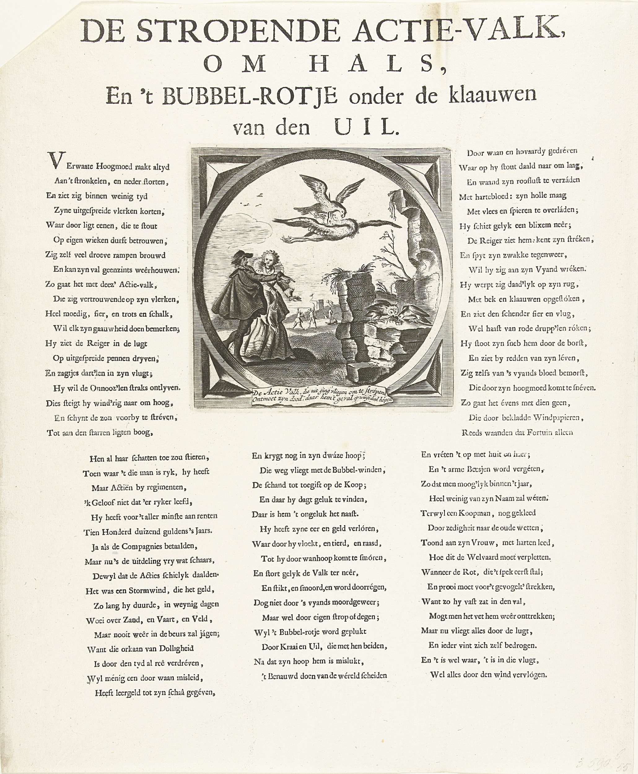 Embleem waarin een valk (de actievalk) die mee wil eten van de buit (het bubbelratje) van de uil, wordt gedood door een reiger. Met vijf verzen aan weerszijden en onder de plaat. Prent 55 in de serie Het Groote Tafereel der Dwaasheid met spotprenten op de Windhandel of Actiehandel van 1720.