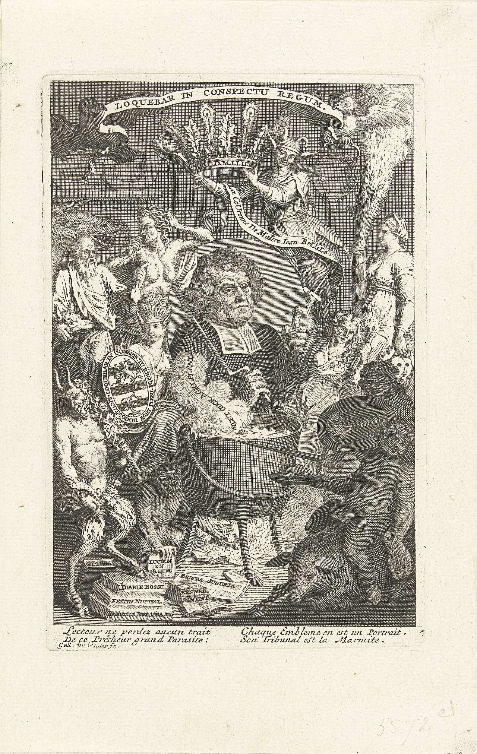 Spotprent op Jean Chrysostome Bruslé de Montpleinchamp, ca. 1712. Portretmedaillon boven een brouwketel waarin geldstukken worden omgetoverd tot aandelen. Heksenketel met duivels, uilen etc. Boven het portret de Zotheid met een kroon van pauwenveren en hulstbladeren. Hierboven een banderol met: Loquebar in conspectu Regum. In het onderschrift 4 regels in het Frans. Oorspronkelijke staat van ...
