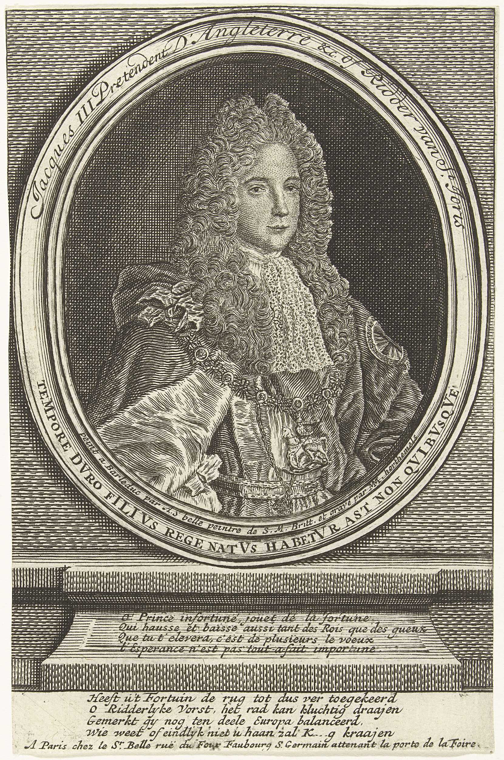 Ovaal portret van de pretendent Jacobus III (Jacobus Frans Eduard) in medaillon, ten halven lijve, naar rechts, ca. 1720. Met randschrift in het Nederlands en Latijn. Onder het portret twee vierregelige verzen in het Frans en Nederlands. Behoort tot de groep van bijprenten toegevoegd aan de serie Tafereel der Dwaasheid met spotprenten op de Windhandel ...