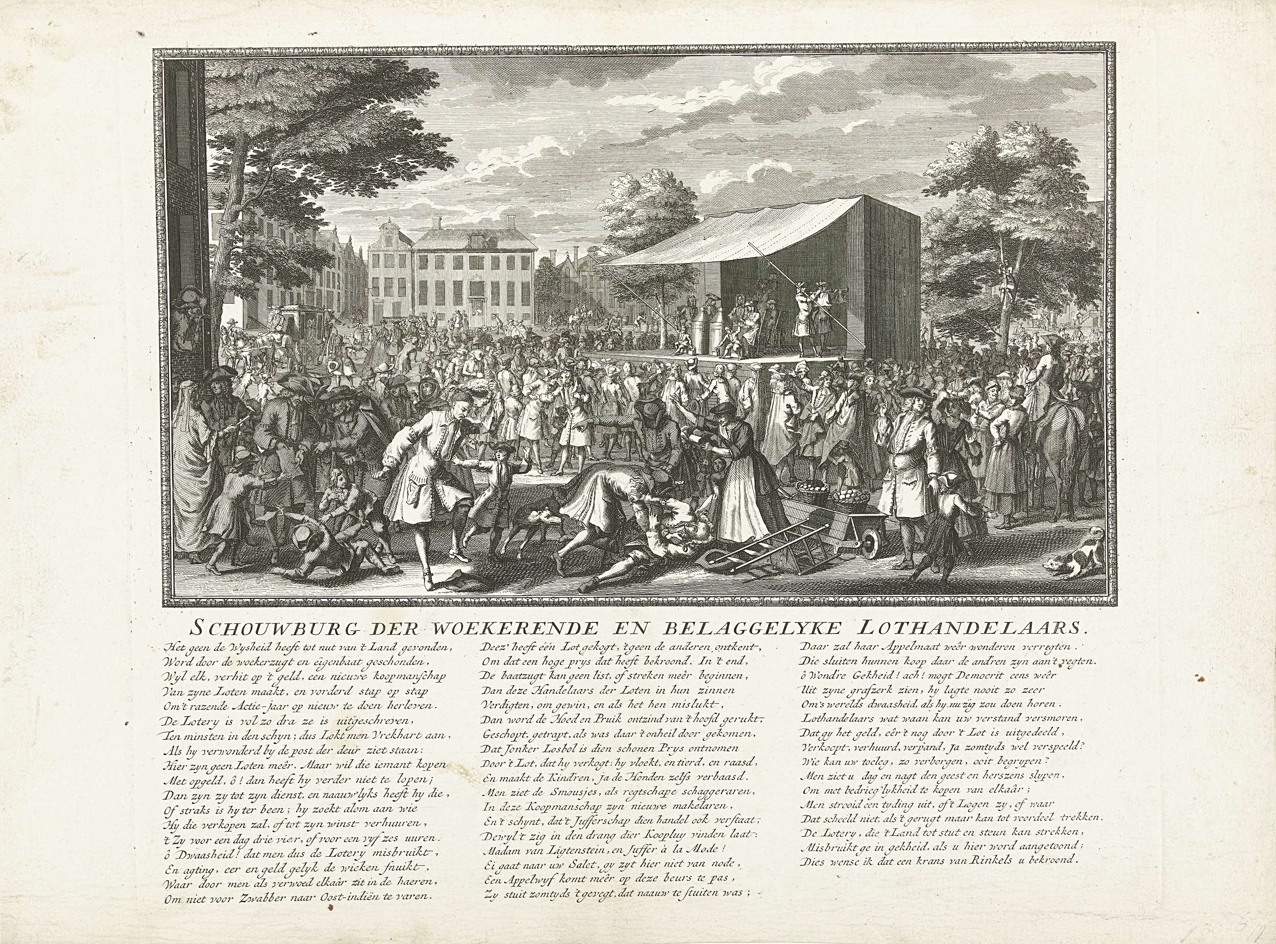 Een loterij op een podium op een stadsplein waarbij de loten uit de bussen getrokken worden door twee jongens. Onder het publiek op de voorgrond breken gevechten uit. In het onderschrift een vers in drie kolommen waarin gerefereerd wordt aan het actiejaar 1720. Behoort tot de groep van bijprenten toegevoegd aan de serie Tafereel der ...