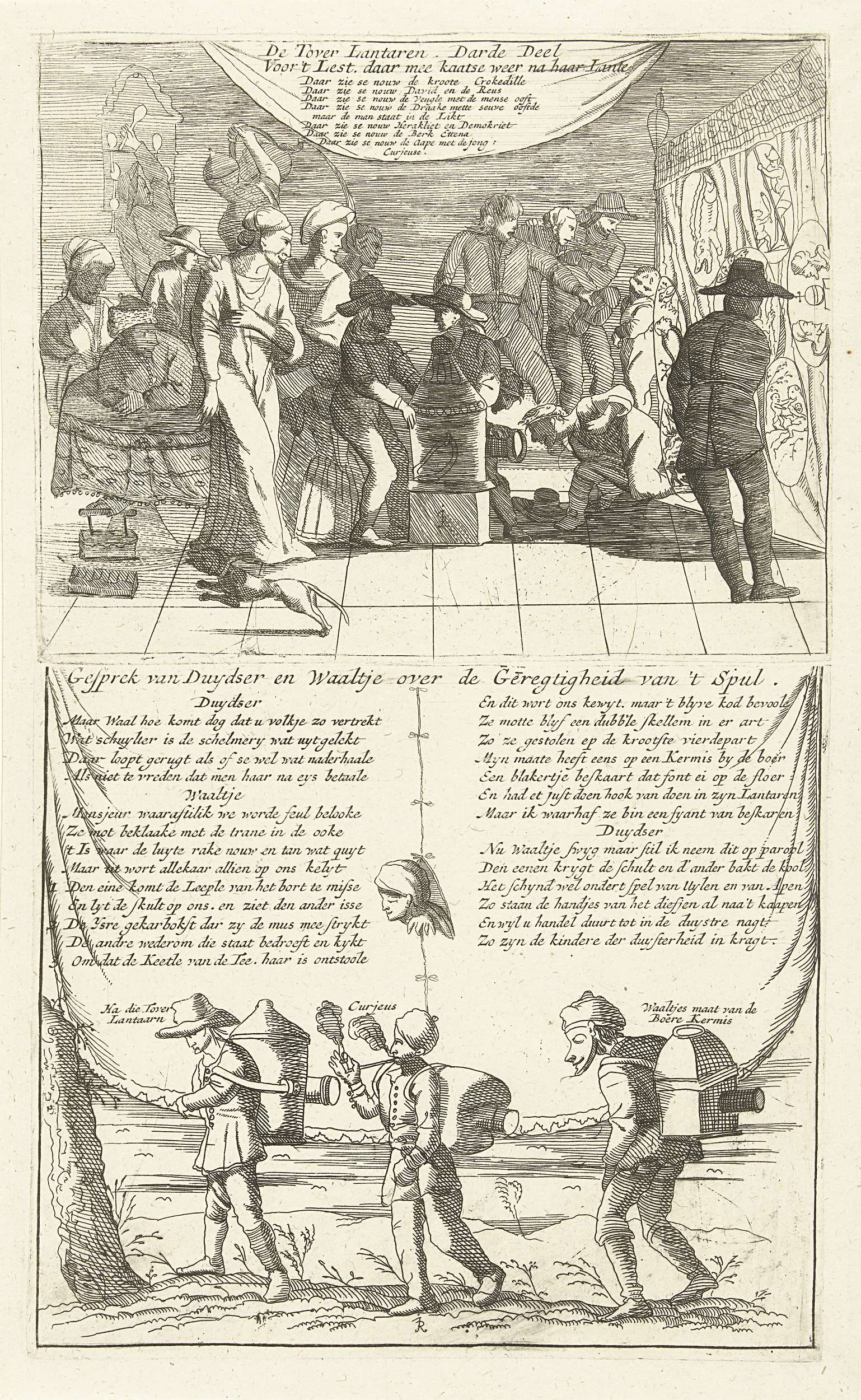 De toverlantaarn. Voorstelling in twee delen. Boven een interieur waarin een voorstelling met de toverlantaarn wordt gegeven. Onder drie mannen onderweg elk met een toverlantaarn op de rug, zij worden in het begeleidend vers met een samenspraak aangeduid als: Duydser, Curjeus en Waaltje. Uit het gordijn waarop de verzen staan steekt nu een hoofd. Derde ...