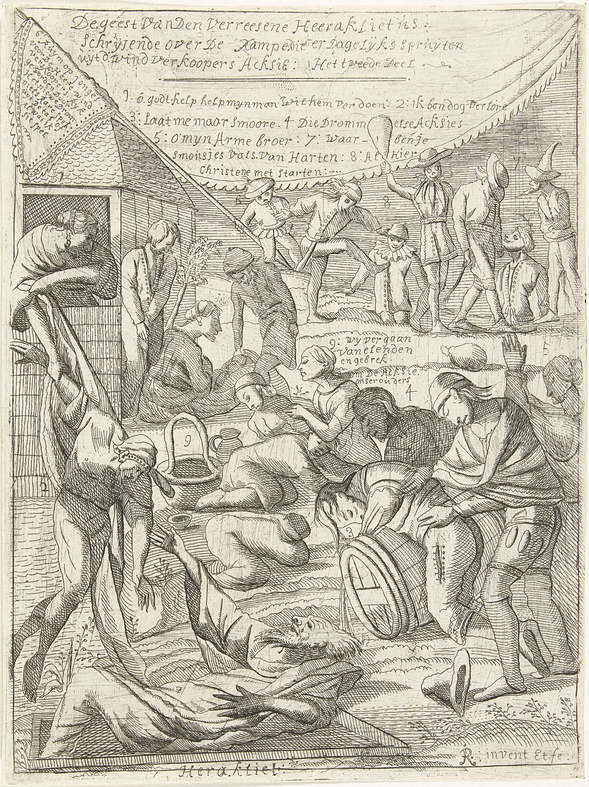 De rampzalige gevolgen van de actiehandel. Armoede en wanhoop onder de families die alles hebben verloren in de actiehandel. Op de voorgrond de treurende Heraclitus. Bovenaan de verklaring van de cijfers 1-9. Behoort tot de groep van bijprenten toegevoegd aan de serie Tafereel der Dwaasheid met spotprenten op de Windhandel of Actiehandel van 1720.