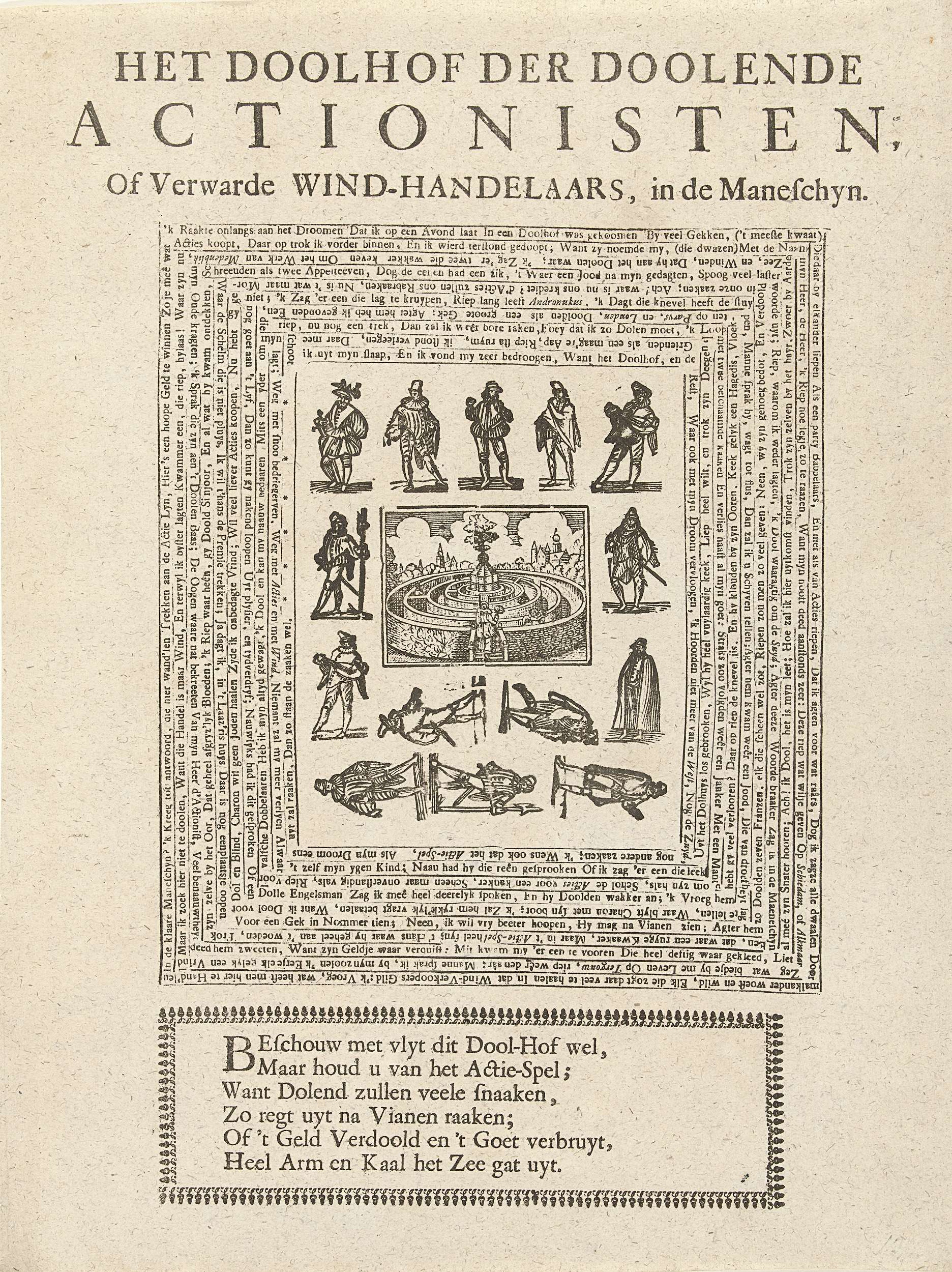 Het Doolhof der Doolende Actionisten. Blad met een vers gedrukt in de vorm van een doolhof, in het midden een voorstelling van een doolhof omringd door losse staande spelfiguren. Behoort tot de groep van bijprenten toegevoegd aan de serie Tafereel der Dwaasheid met spotprenten op de Windhandel of Actiehandel van 1720.