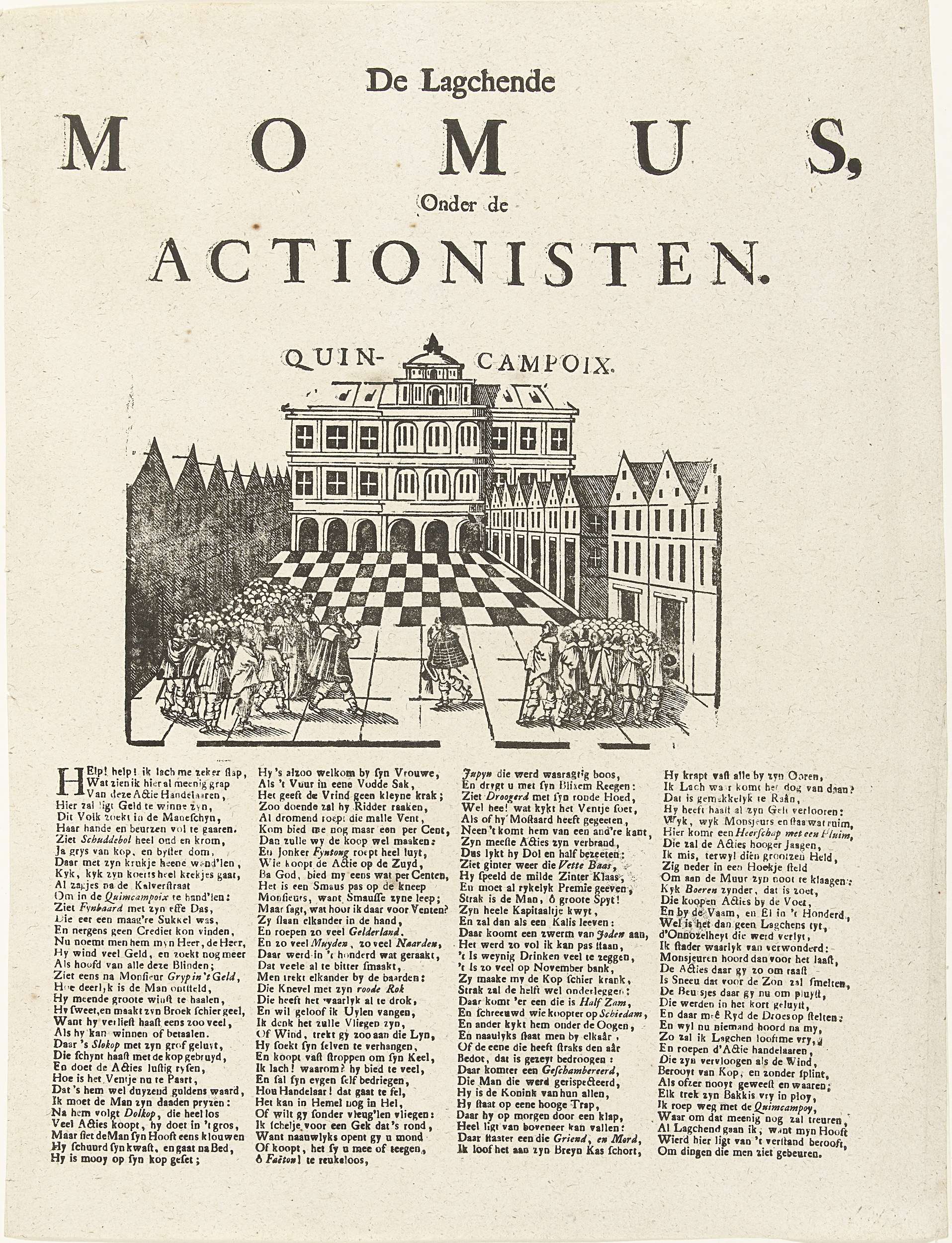 Blad met bovenaan een voorstelling van de ontmoeting tussen twee groepen en hun leiders op een stadsplein met een groot gebouw aangeduid als Quincampoix, volgens de tekst de Koffiehuis Quincampoix in de Kalverstraat te Amsterdam. Met een vers in vier kolommen waarin de spot wordt gedreven met de actionisten en de windhandel in het jaar ...