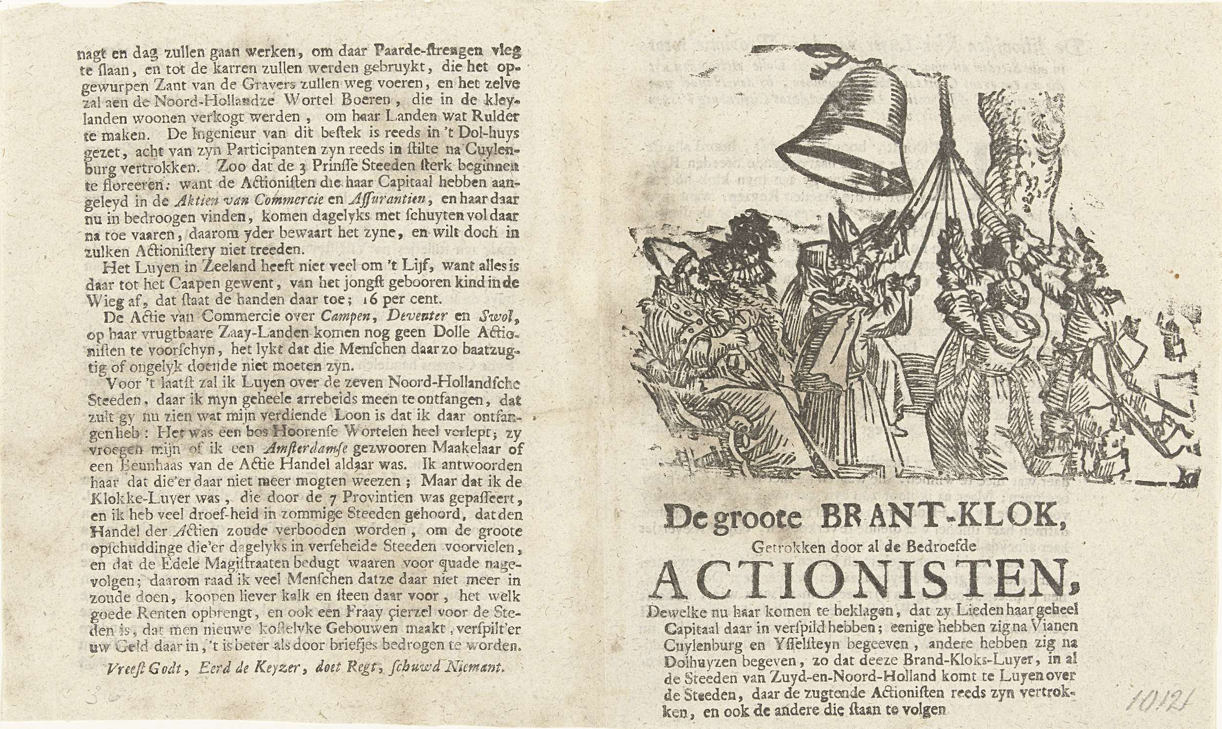 Pamflet van een dubbelgevouwen blad bedrukt op alle vier bladzijden met tekst over de windhandel van 1720. Op de voorzijde een voorstelling van het luiden door roomse geestelijken en militairen van een grote klok die aan een boom hangt. Links kijkt een bisschop zittend in een stoel toe. Behoort tot de groep van bijprenten toegevoegd ...