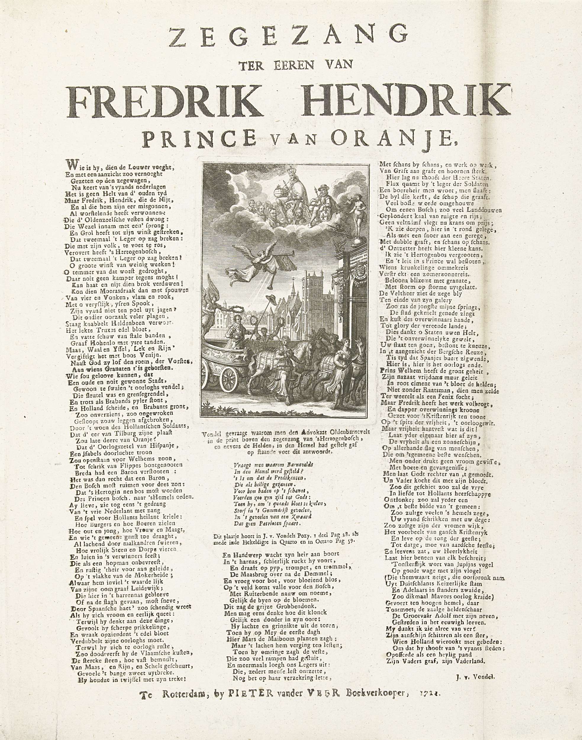 Allegorische triomfantelijke intocht van Frederik Hendrik door een triomfpoort in Den Haag. Allegorie ter ere van de veroveringen van Den Bosch en Wesel door Frederik Hendrik in 1629. Triomfoptocht met de door Overwinning gekroonde stadhouder met de vrijheidslans staande in een strijdwagen, de paarden begeleid door de deugden Rechtvaardigheid (Justitia), Kracht (Fortitudo) en Voorzichtigheid (Prudentia). ...