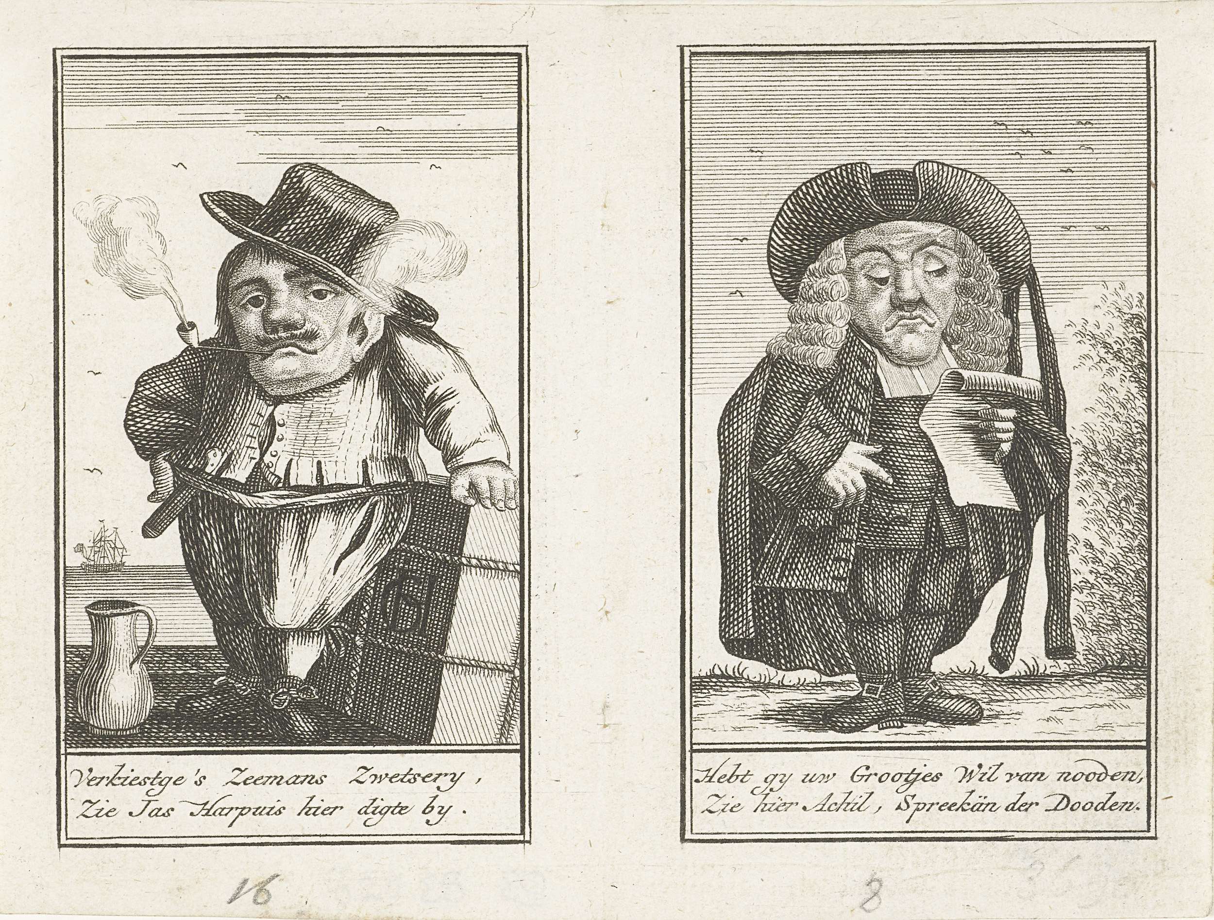 Twee bladzijden met de kleine mensen Jas Harpuis en Achil, ca. 1720. Afkomstig uit een uitgave van ca. 1775 met verkleinde kopieën naar de oorspronkelijke Nederlandse serie met karikaturen van kleine mensen uit 1716, bekend als Het Dwergentooneel.