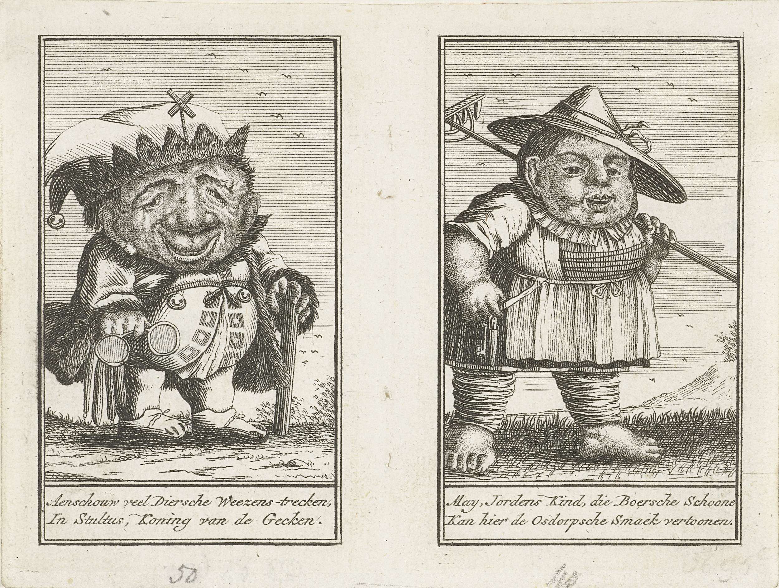 Twee bladzijden met de kleine mensen Stultus en May, ca. 1720. Afkomstig uit een uitgave van ca. 1775 met verkleinde kopieën naar de oorspronkelijke Nederlandse serie met karikaturen van kleine mensen uit 1716, bekend als Het Dwergentooneel.