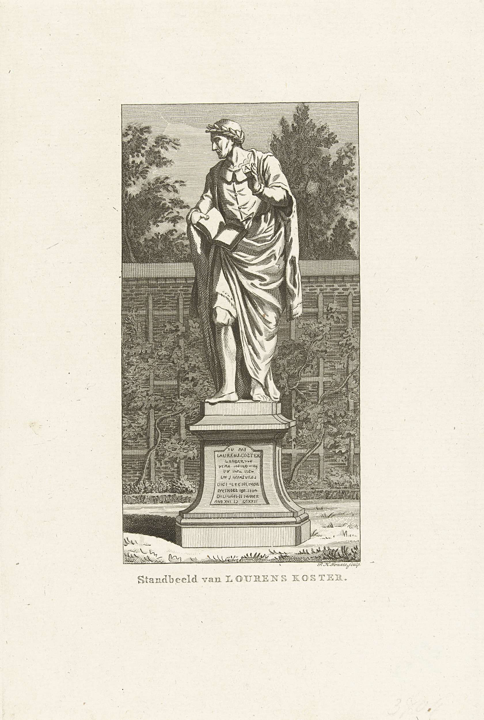 Standbeeld van de Haarlemse drukker Laurens Jansz. Coster, ter gelegenheid van de derde eeuwfeest van de uitvinding van de boekdrukkunst te Haarlem in 1423. Standbeeld van Gerrit van Heerstal en Rochus Verbeek naar de tekening van Romeyn de Hooghe, in 1723 staande in de tuin van de Hortus Medicus te Haarlem.