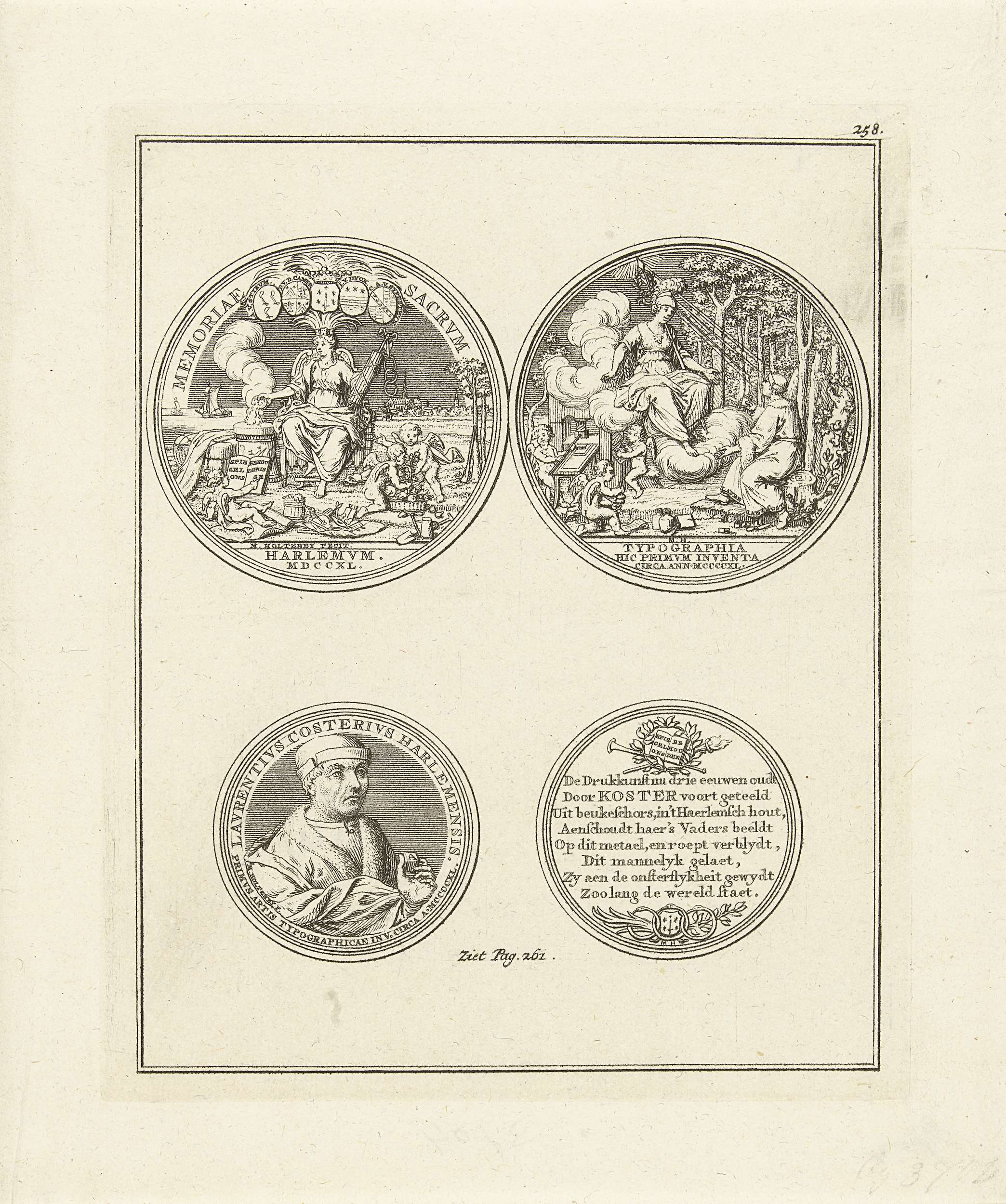 Twee penningen, geslagen in 1740 bij het derde eeuwfeest van de uitvinding van de boekdrukkunst door Laurens Jansz. Coster. Gemerkt bovenaan: 258; onderaan: Ziet Pag. 261.