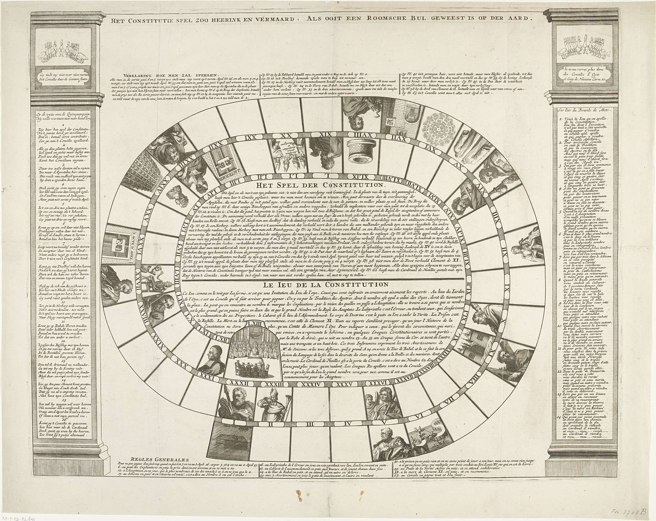 Het Constitutie Spel, 1724. Spotprent op de Bul of Constitutie Unigenitus van paus Clemens XI aangaande de onfeilbaarheid van de paus en tegen de ideeën van de jansenisten, in de vorm van een ganzenbord. Met spelregels in het Nederlands en Frans.