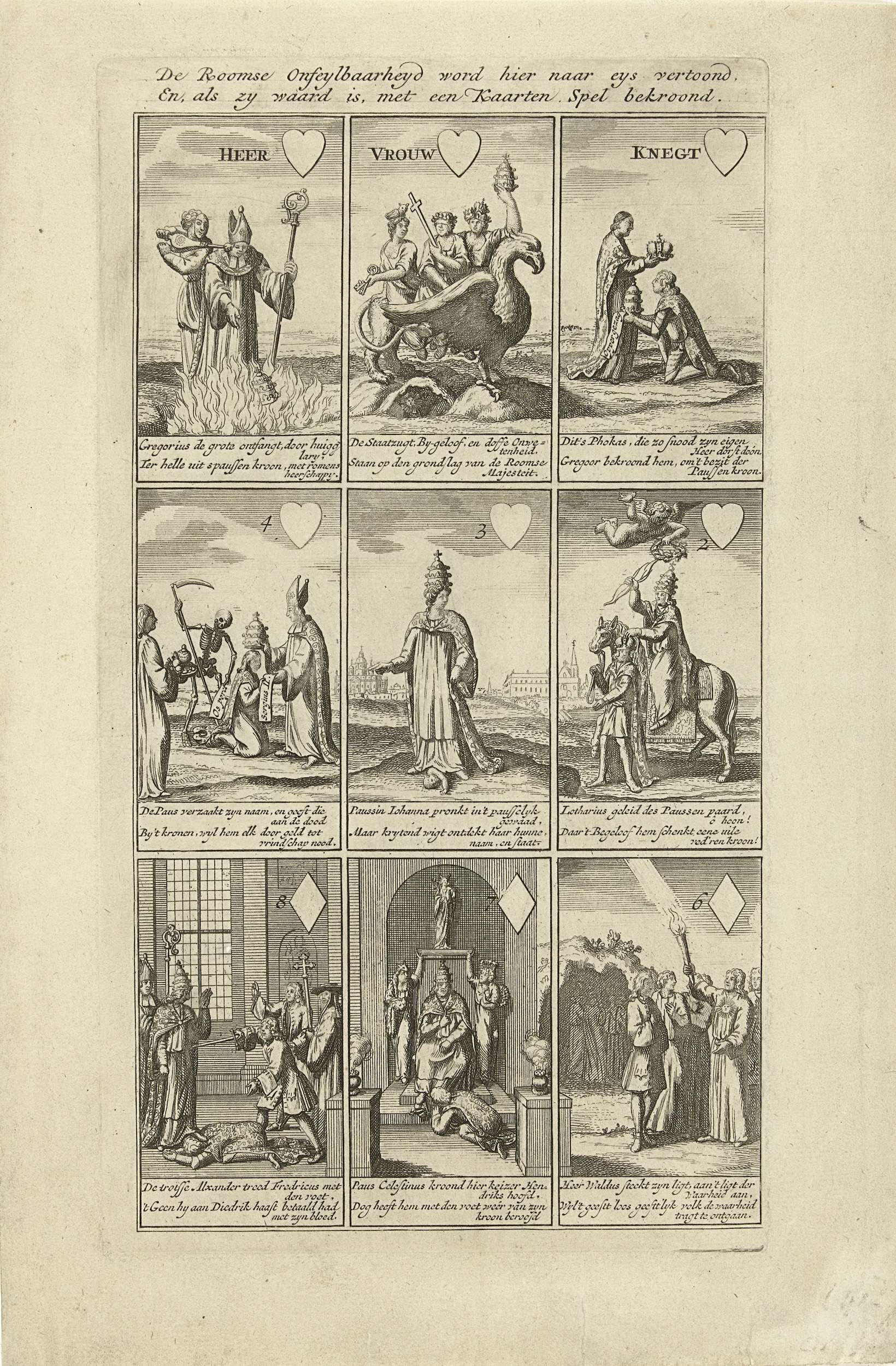 Spotprenten op de Roomse Onfeilbaarheid in de vorm van een kaartspel, 1724. Negen kaarten die verwijzen naar de Bul of Constitutie Unigenitus van paus Clemens XI aangaande de onfeilbaarheid van de paus en tegen de ideeën van de jansenisten en Quesnel. Elk kaart met een onderschrift in het Nederlands.