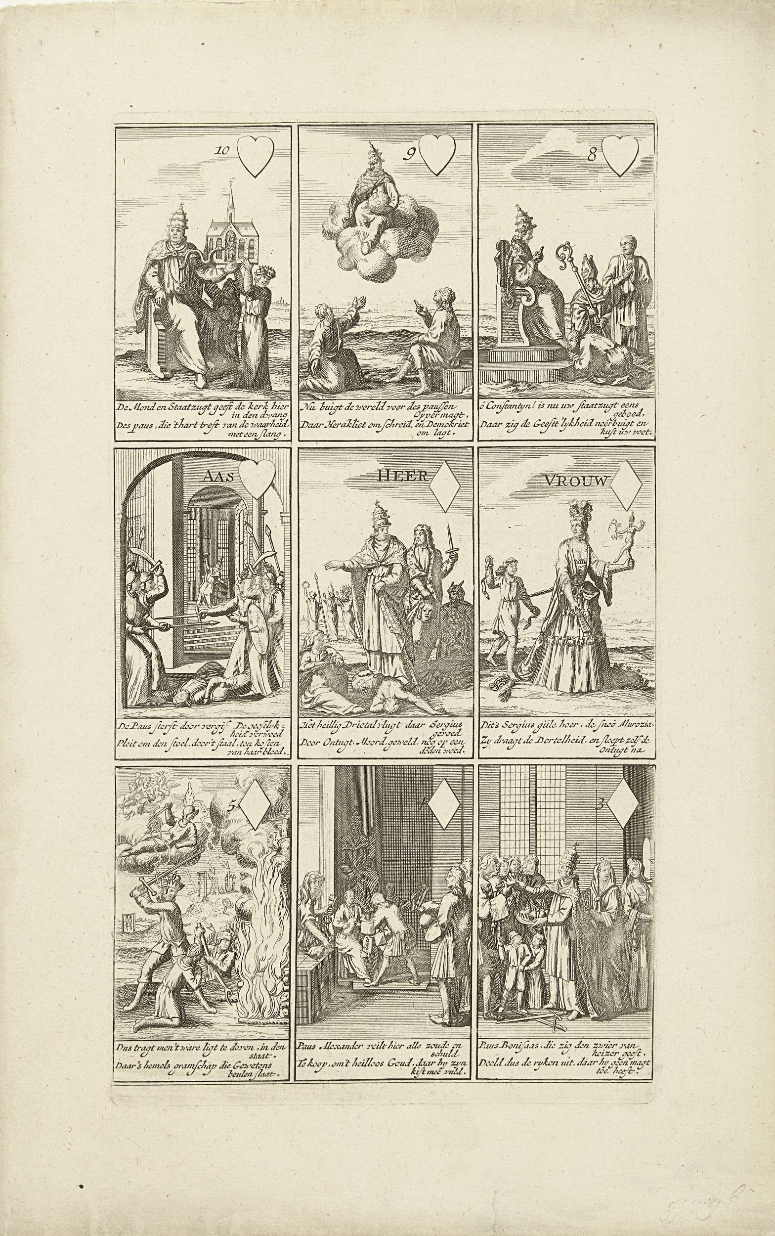 Spotprenten op de Roomse Onfeilbaarheid in de vorm van een kaartspel, 1724. Negen kaarten die verwijzen naar de Bul of Constitutie Unigenitus van paus Clemens XI aangaande de onfeilbaarheid van de paus en tegen de ideeën van de jansenisten en Quesnel. Elk kaart met een onderschrift in het Nederlands.