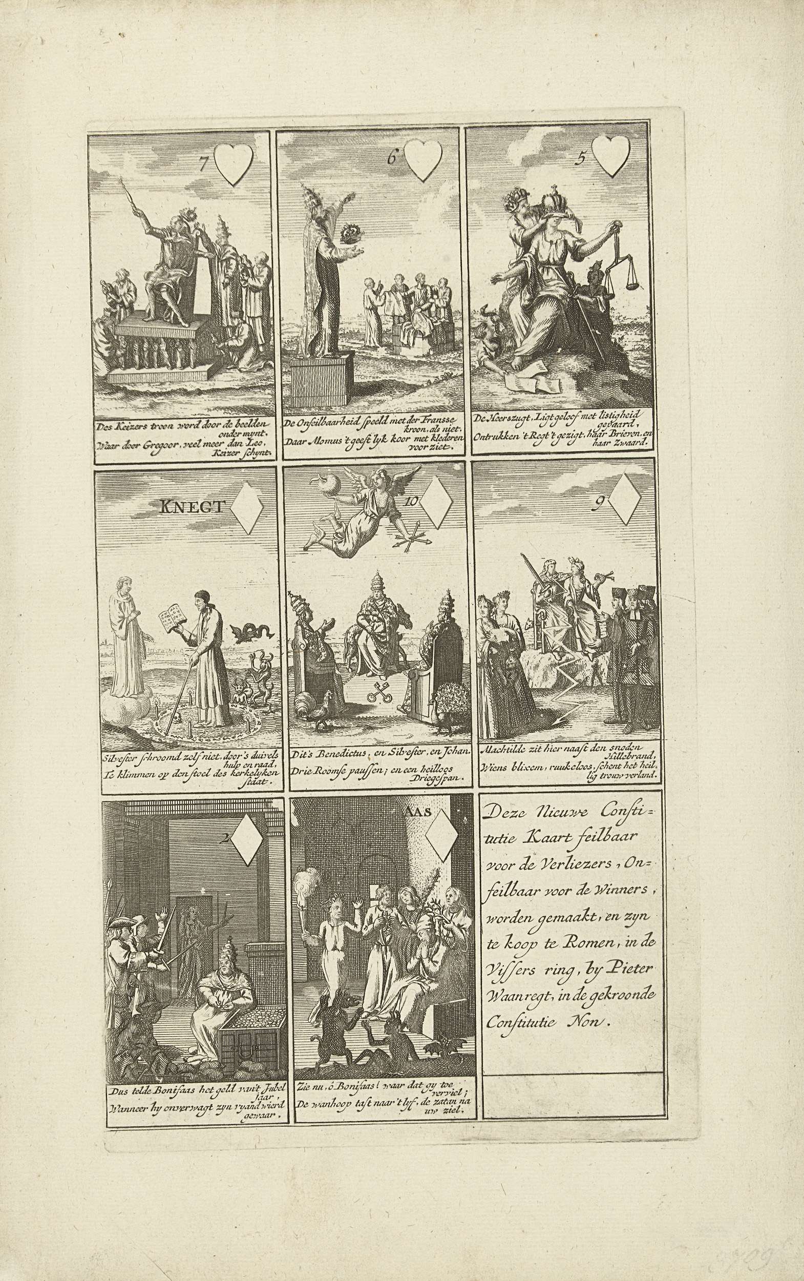 Spotprenten op de Roomse Onfeilbaarheid in de vorm van een kaartspel, 1724. Negen kaarten die verwijzen naar de Bul of Constitutie Unigenitus van paus Clemens XI aangaande de onfeilbaarheid van de paus en tegen de ideeën van de jansenisten en Quesnel. Elk kaart met een onderschrift in het Nederlands.