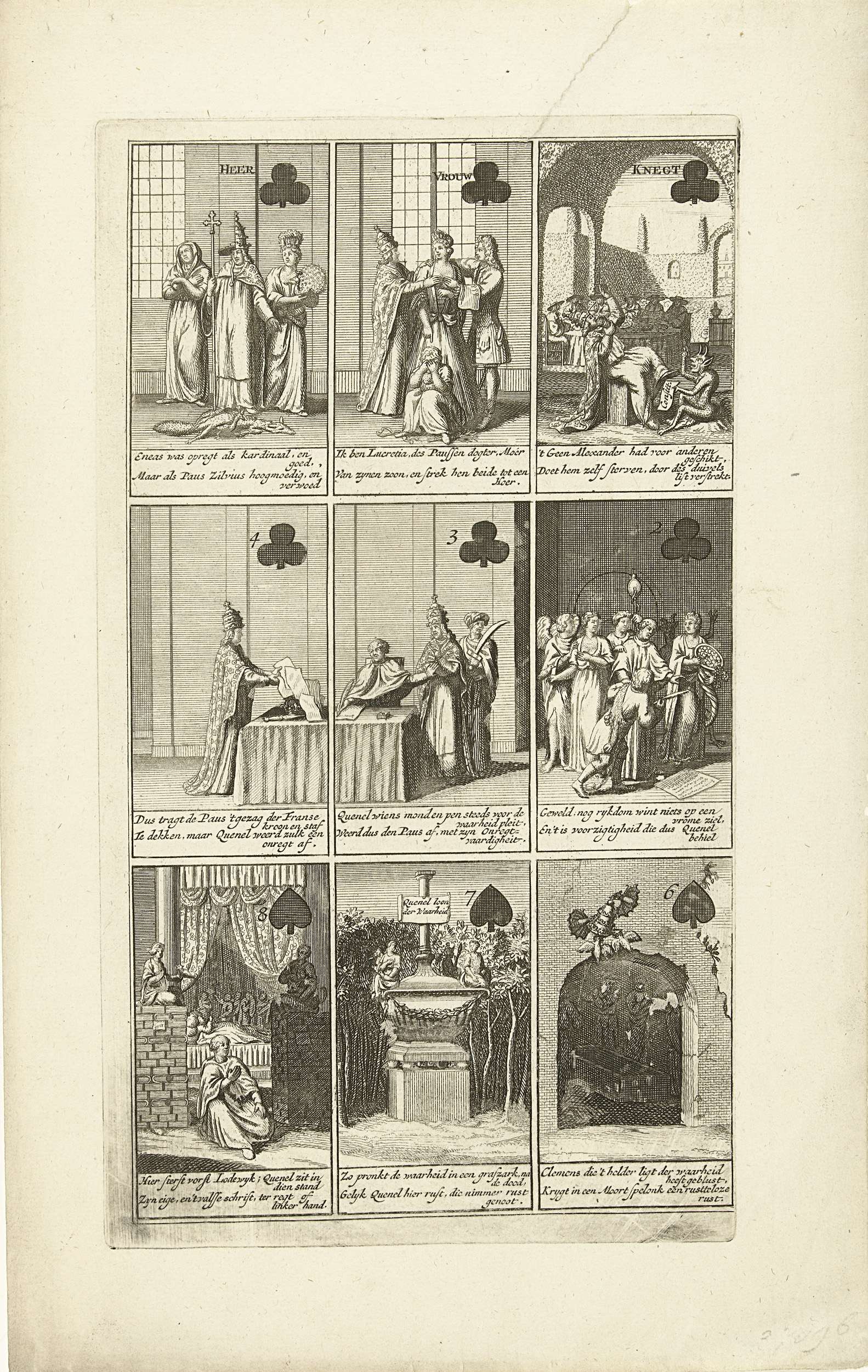 Spotprenten op de Roomse Onfeilbaarheid in de vorm van een kaartspel, 1724. Negen kaarten die verwijzen naar de Bul of Constitutie Unigenitus van paus Clemens XI aangaande de onfeilbaarheid van de paus en tegen de ideeën van de jansenisten en Quesnel. Elk kaart met een onderschrift in het Nederlands.