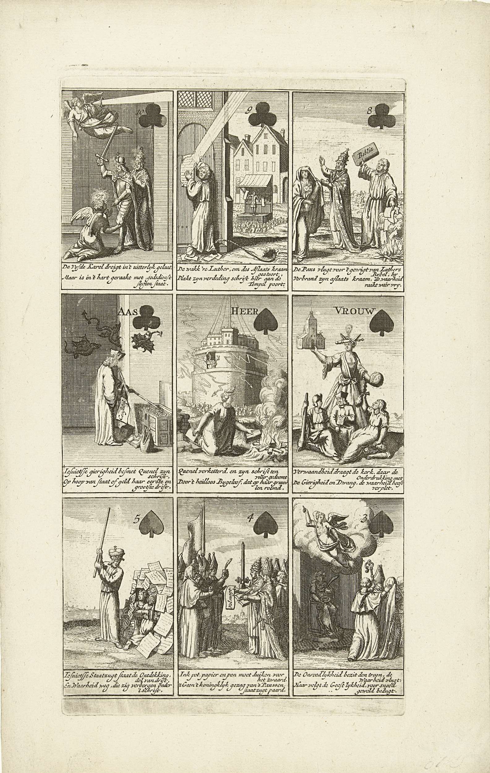 Spotprenten op de Roomse Onfeilbaarheid in de vorm van een kaartspel, 1724. Negen kaarten die verwijzen naar de Bul of Constitutie Unigenitus van paus Clemens XI aangaande de onfeilbaarheid van de paus en tegen de ideeën van de jansenisten en Quesnel. Elk kaart met een onderschrift in het Nederlands.