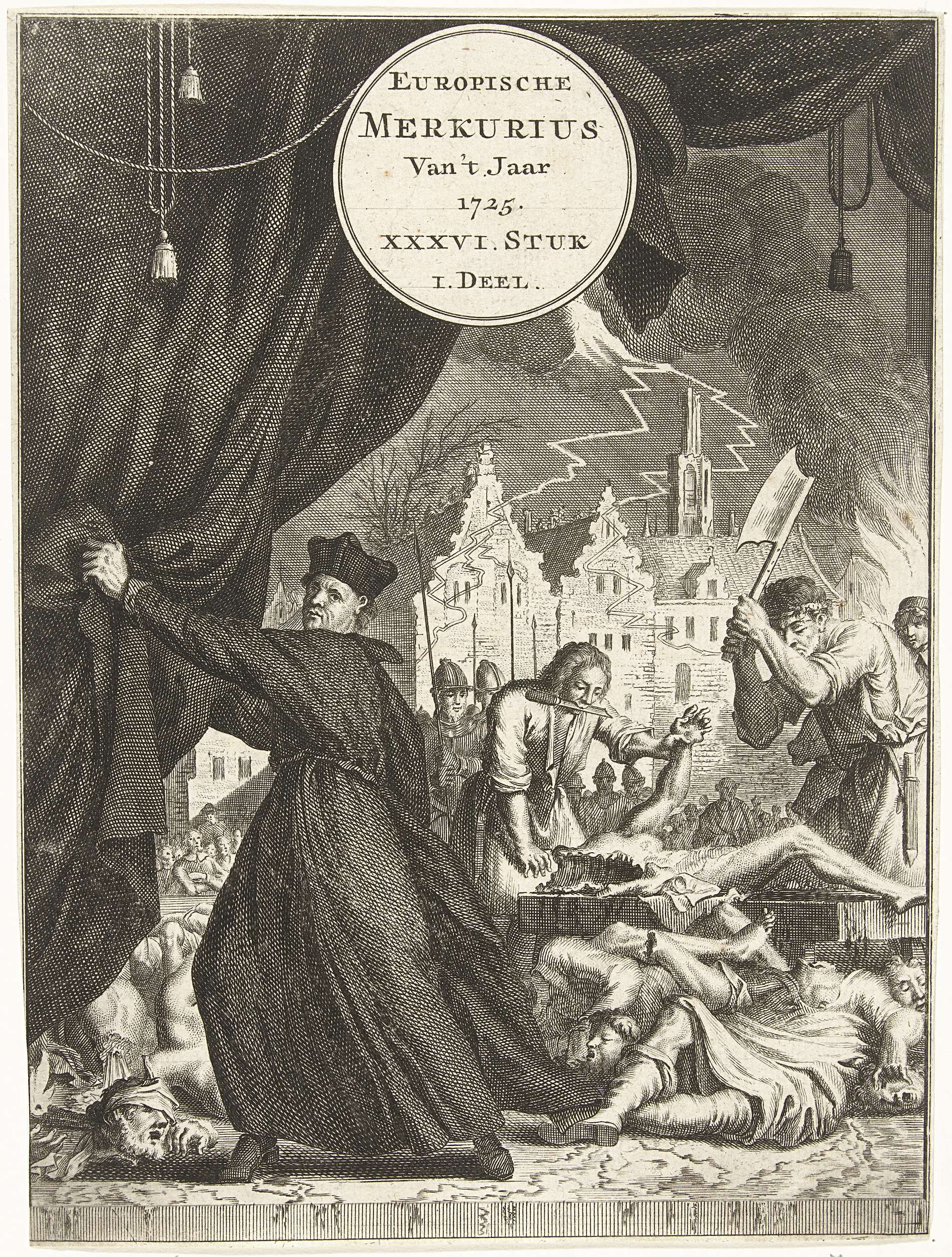 Titelpagina voor de Europische Mercurius, dl. XXXVI over het jaar 1725. Een geestelijke trekt een gordijn opzij en onthult een schavot waarop de lichamen van veroordeelden in stukken worden gehakt.
