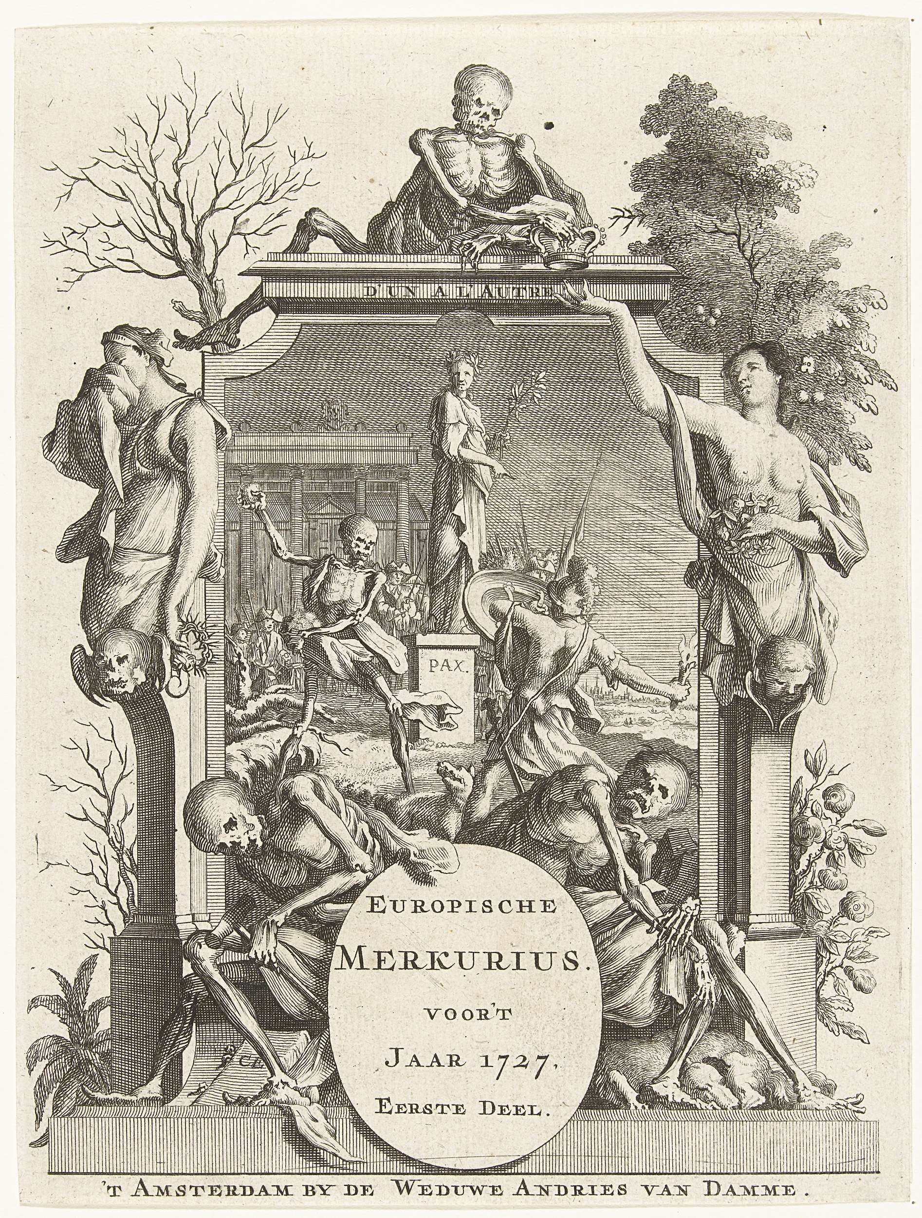 Titelpagina voor de Europische Mercurius, dl. XXXVIII over het jaar 1727. Strijd tussen de Dood en een soldaat voor een standbeeld van de Vrede, op de voorgrond enkele skeletten.