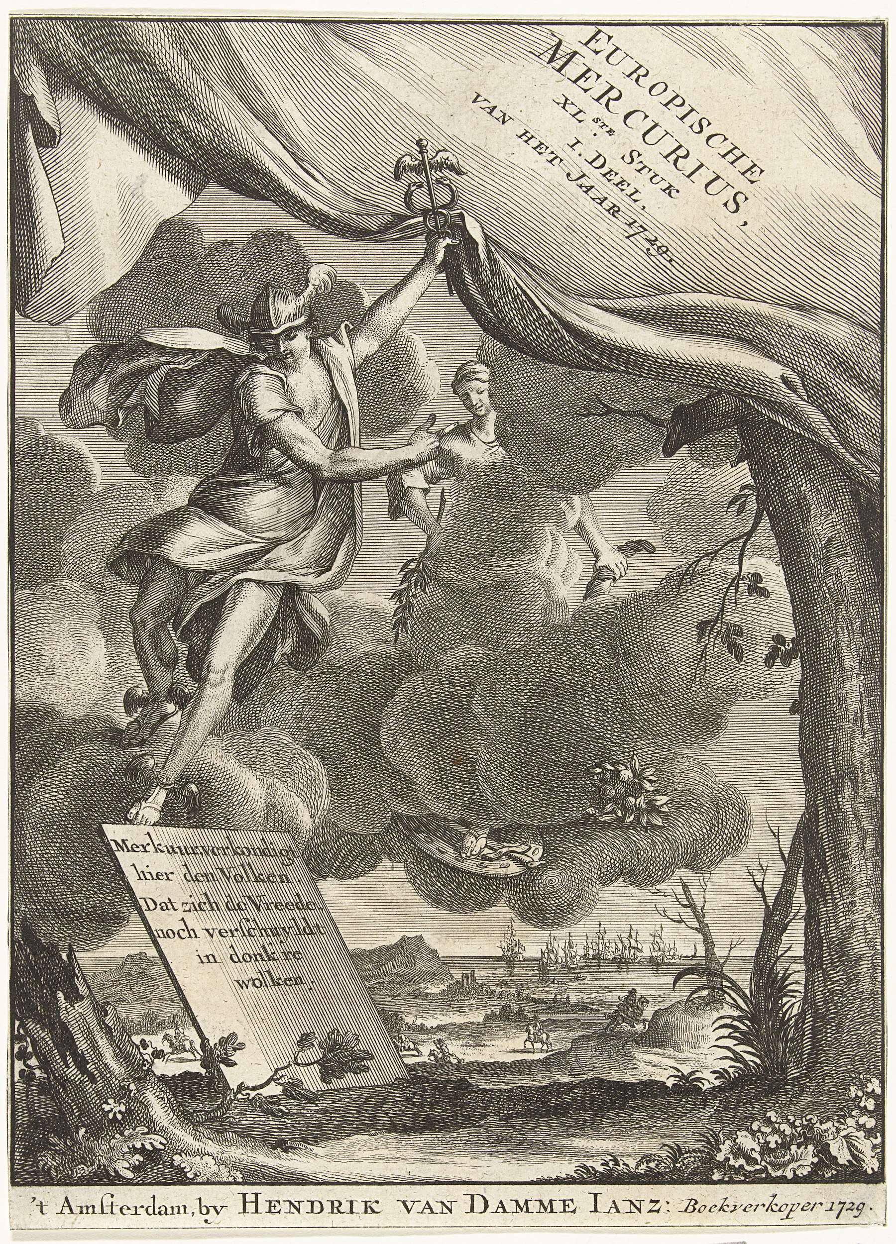 Titelpagina voor de Europische Mercurius, dl. XL over het jaar 1729. Mercurius tilt een gordijn op om te onthullen dat de Vrede verhult gaat achter donkere wolken.