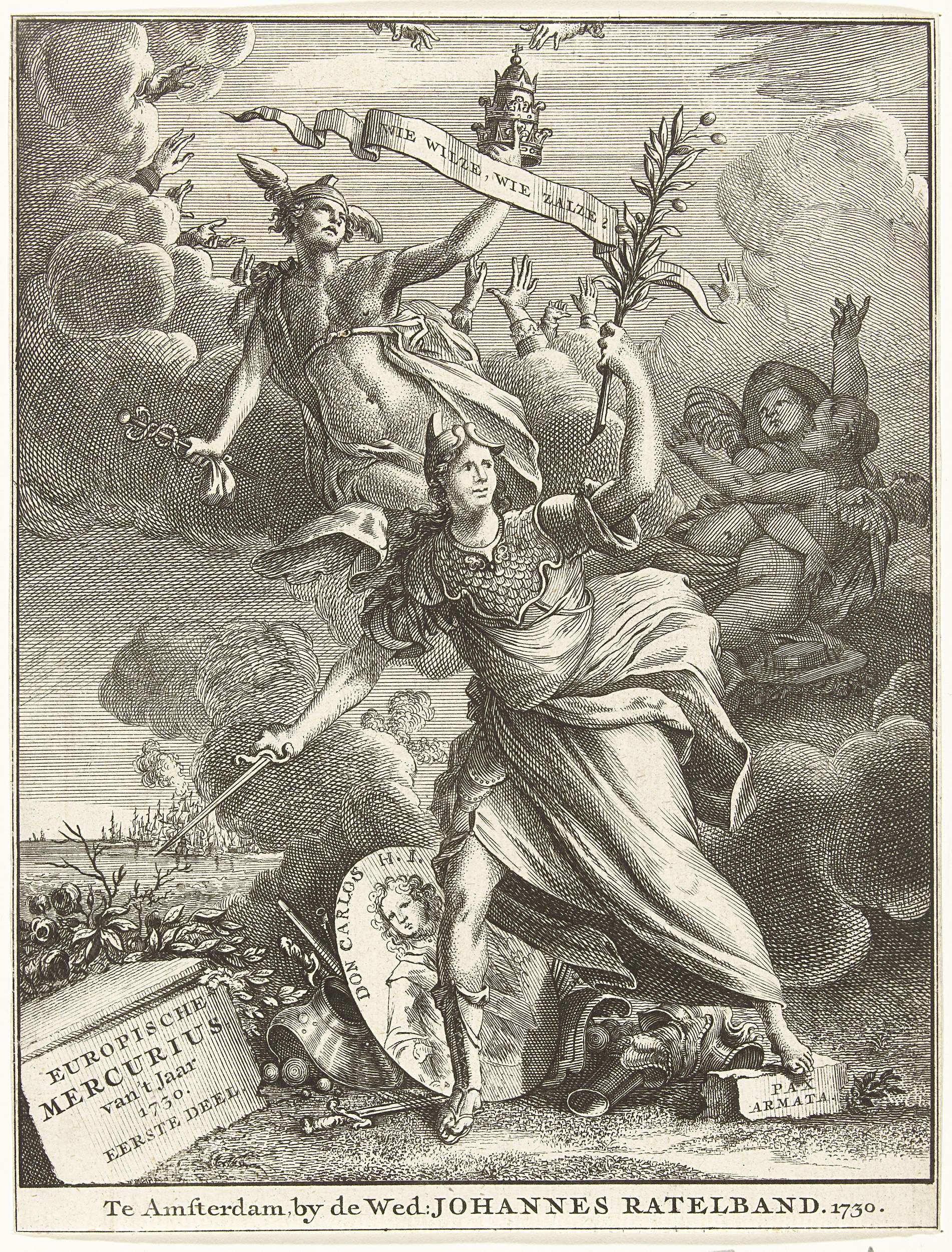 Titelpagina voor de Europische Mercurius, over het jaar 1730. De Gewapende Vrede trekt met dolk en olijftak ten strijde. In de lucht Mercurius met een pauselijke kroon.