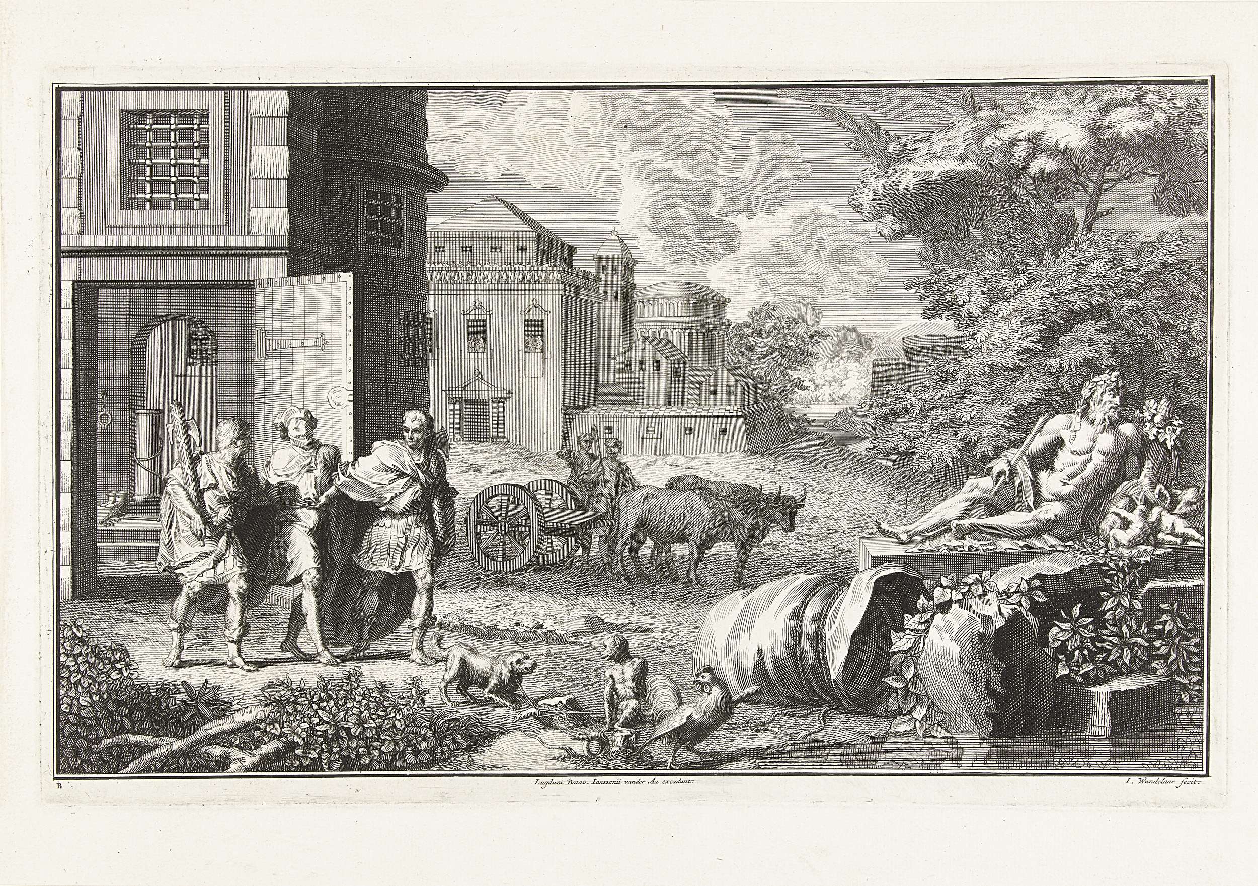 Historische voorstelling van de bestraffing van een homosexueel of sodomiet volgens de Romeinse wet. Een gevangene wordt door twee bewakers uit de gevangenis geleid met een zak over het hoofd. Op de voorgrond een grote zak, hond, aap, slang en haan die volgens gebruik samen met de gevangene in één zak gebonden en verdronken werden. ...