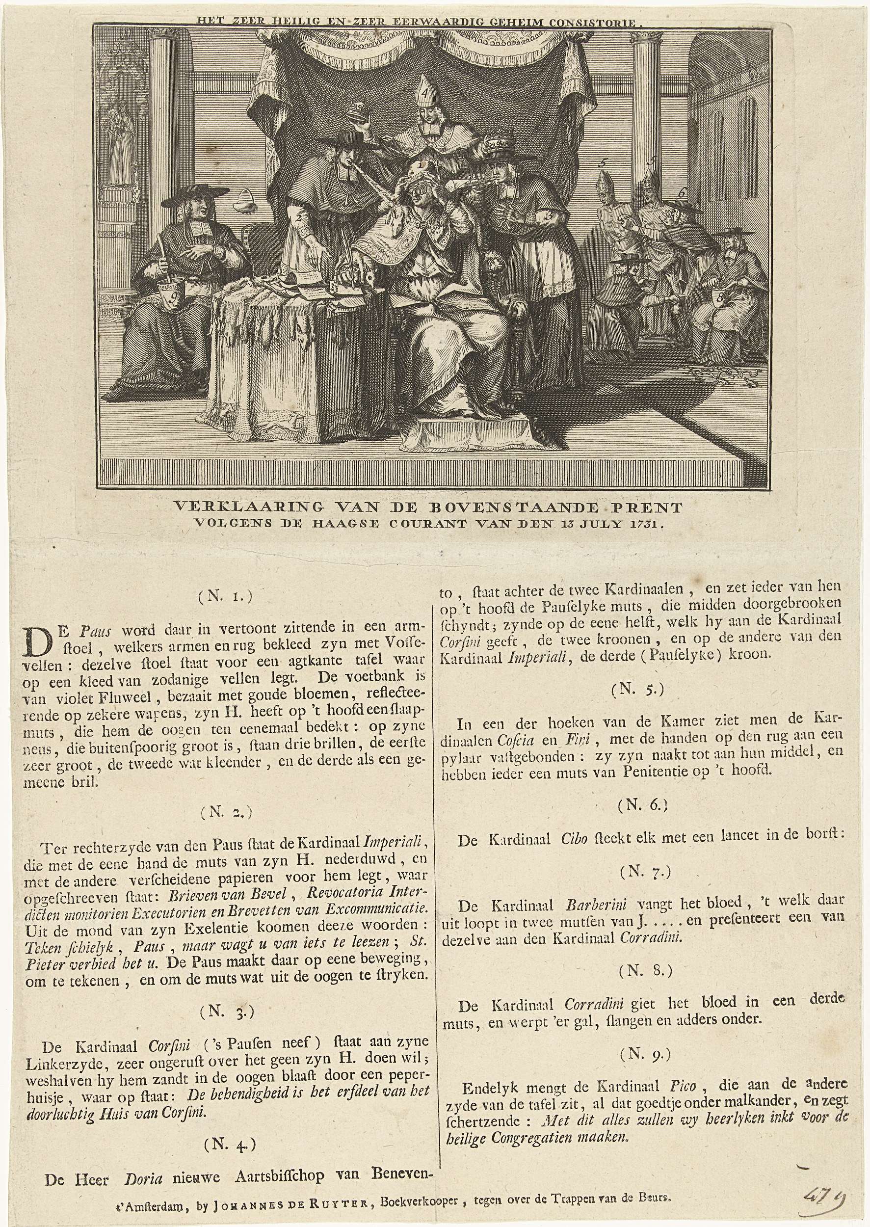Spotprent op de paus en kardinalen, in verband met het verzet tegen de bezetting van Parma door Oostenrijk, na de dood van de hertog van Parma, juni 1731. De slechtziende paus (met drie brillen) wil een document ondertekenen maar wordt door kardinalen zand in de ogen geblazen. Op het blad onder de plaat de verklaring ...