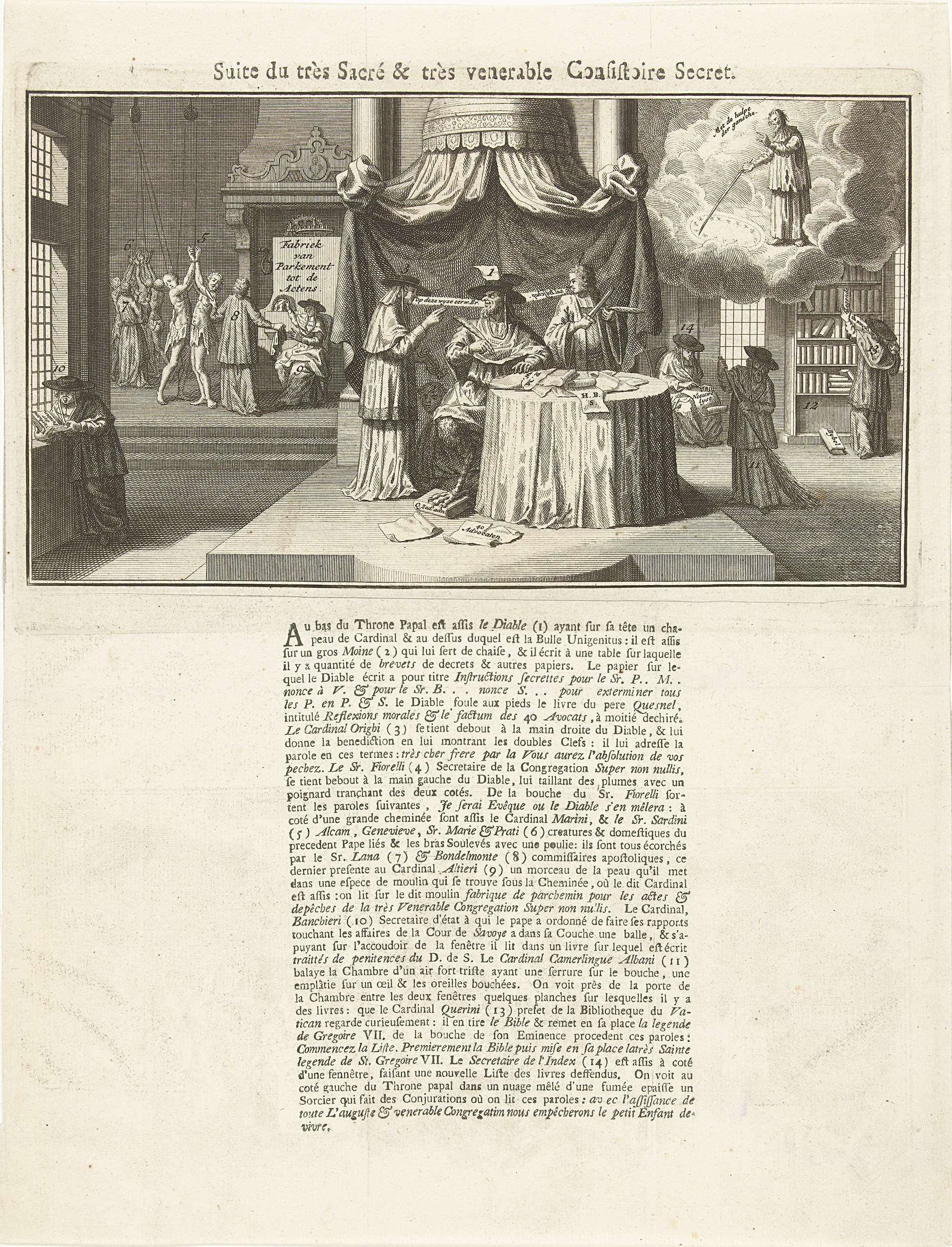 Spotprent met de duivel gezeten op de pauselijke troon, om hem heen kardinalen die allerlei plannen beramen, waaronder de bul Unigenitus en de vervolgingen in Savoye, 1731. Op het blad onder de plaat de verklaring van de de cijfers 1-14 in het Frans.