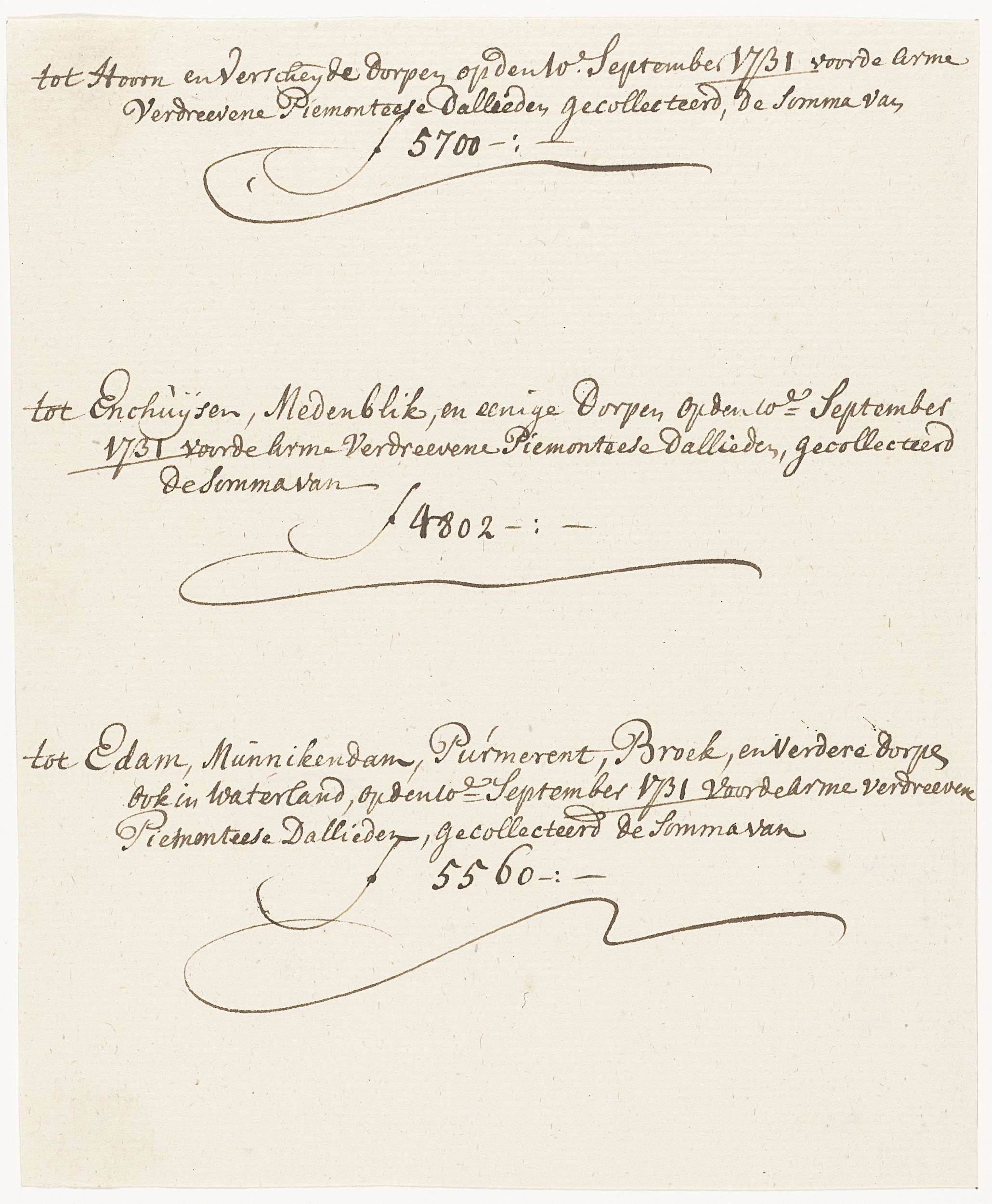 Blaadje met de opgave van de opbrengsten van de collectes voor de uit Piemonte verdreven gereformeerde Dallieden (Waldenzers) gehouden te Hoorn, Enkhuizen, Medemblik, Edam, Monnikendam en andere plaatsen, 10 september 1731.