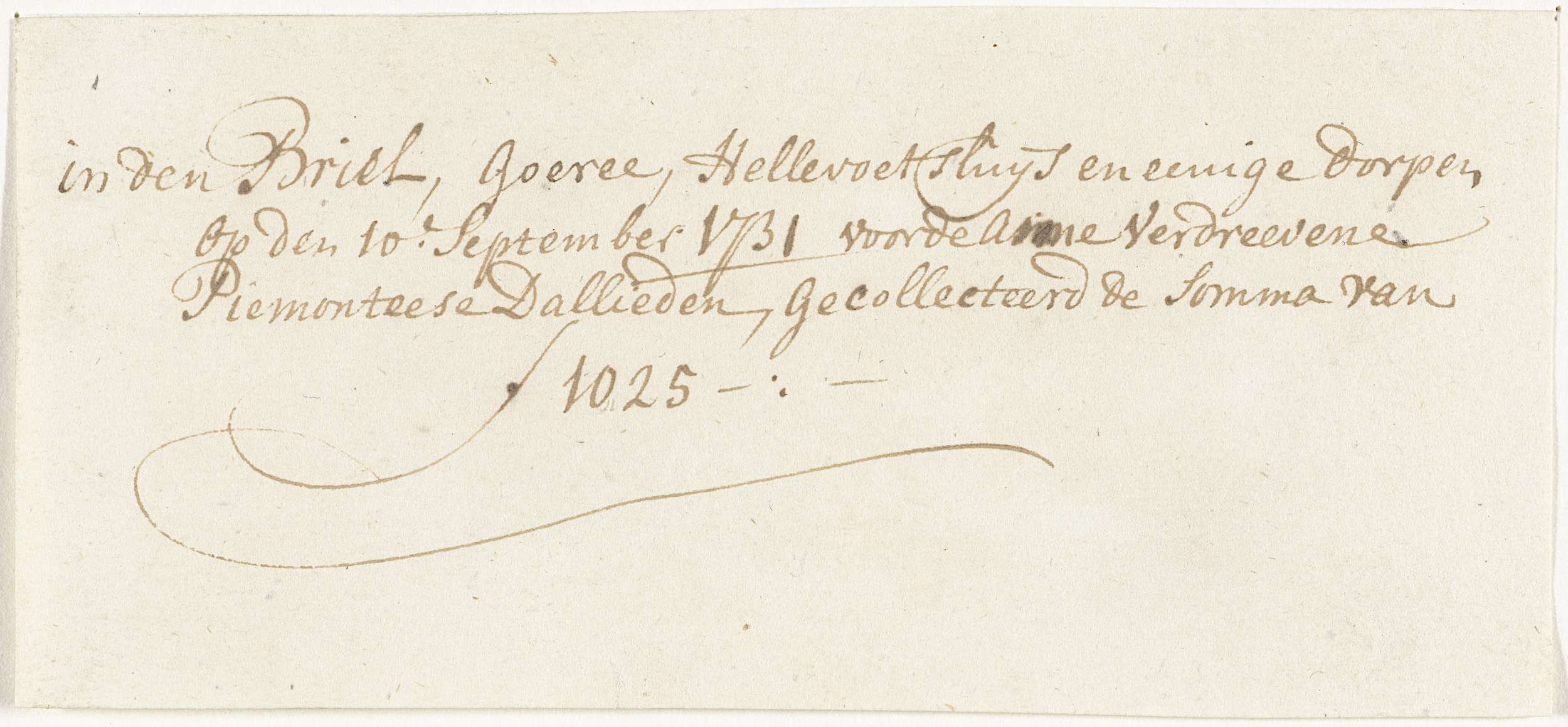 Blaadje met de opgave van de opbrengsten van de collectes voor de uit Piemonte verdreven gereformeerde Dallieden (Waldenzers) gehouden te Den Briel, Goeree, Hellevoetsluis en andere dorpen, 10 september 1731.