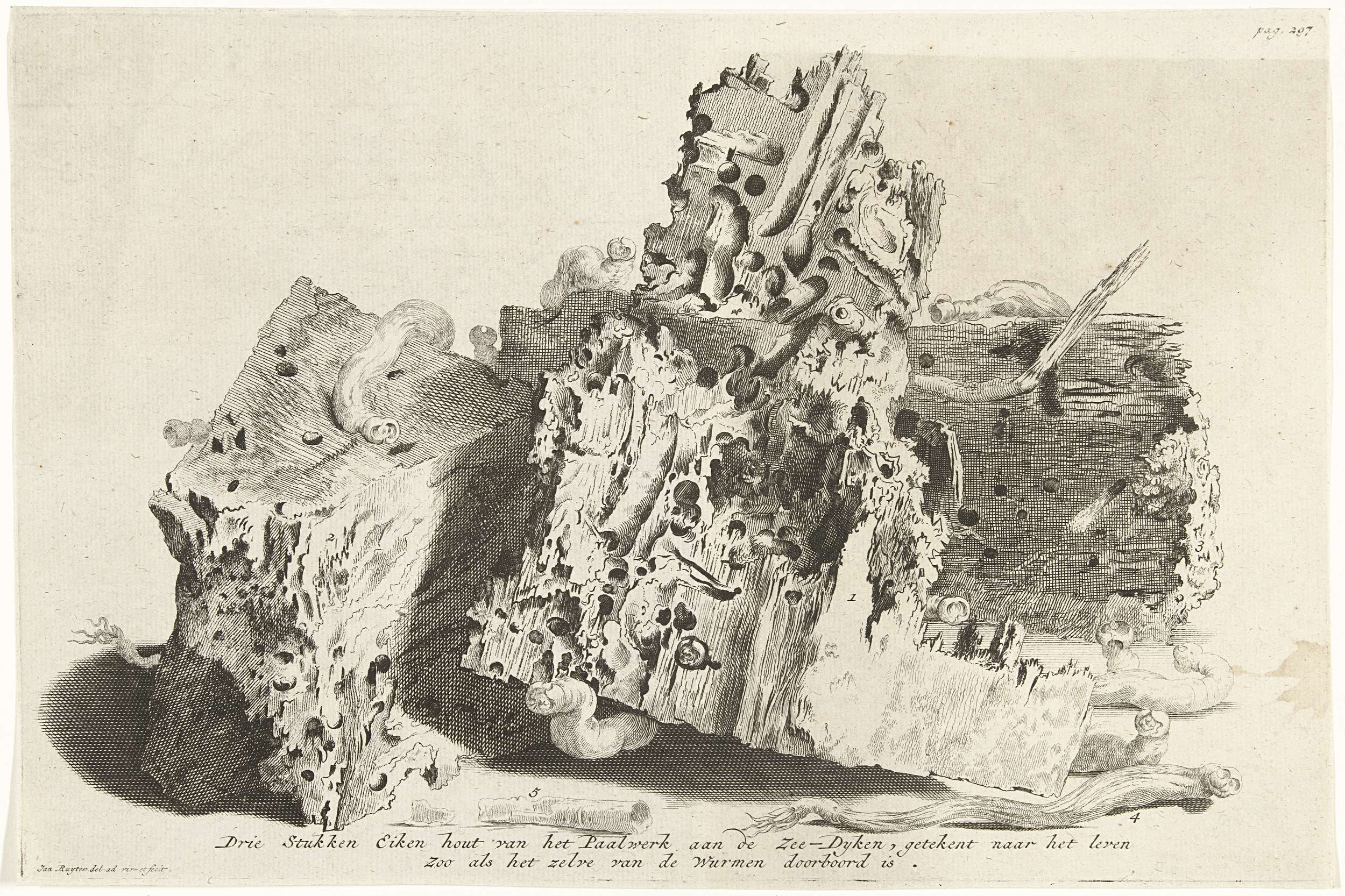 Enkele delen van het paalwerk van de dijkbeschoeiïngen aangetast door paalwormen, 1731. Gemerkt rechtsboven: pag. 297.