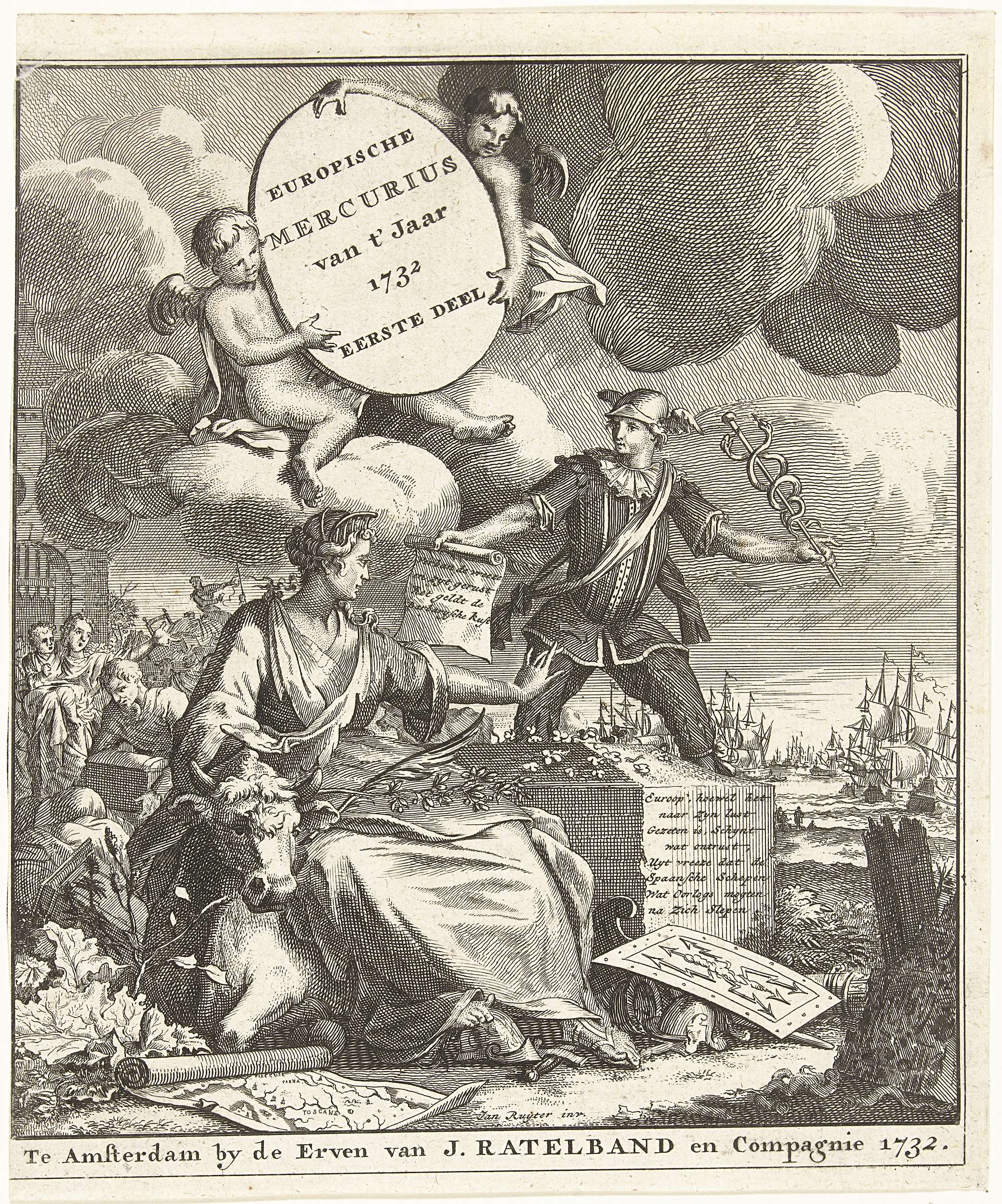 Titelpagina voor de Europische Mercurius, over het jaar 1732. Mercurius toont Europa het document dat vrede belooft aan de Noord-Afrikaanse kustgebied dat destijds bekend stond als ‘Barbarije’.