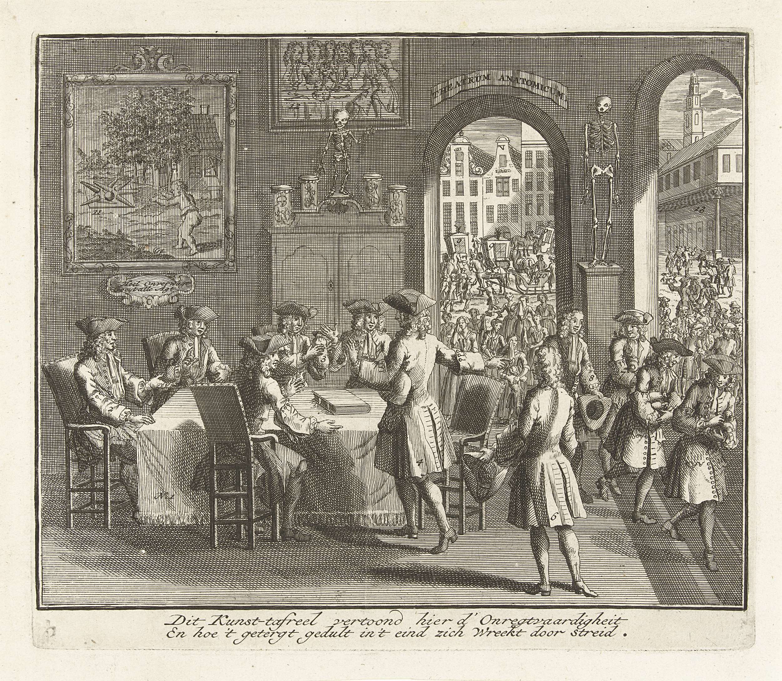 Allegorie op het afzetten van de acht overlieden van het Chirurgijnsgilde te Amsterdam, 24 januari 1732. Vergadering van de overlieden geleid door Abraham Titsingh in de gildekamer, links lopen drie grijnzende overlieden weg met het geld uit de weduwenkas. Aan de muur enkele allegorische schilderijen, boven de poort: Theatrum Anatomicum. In het onderschrift een tweeregelis ...